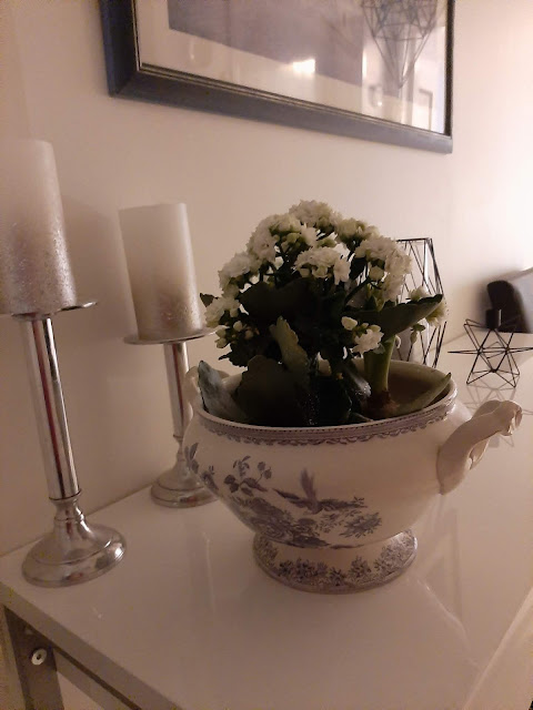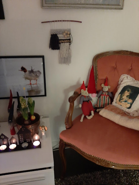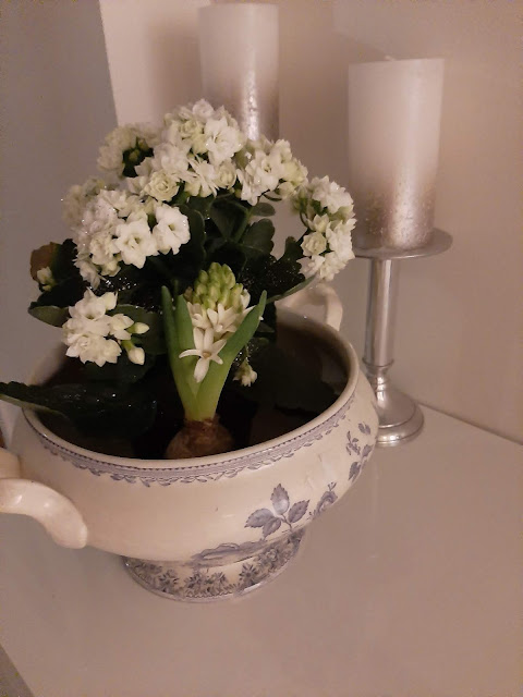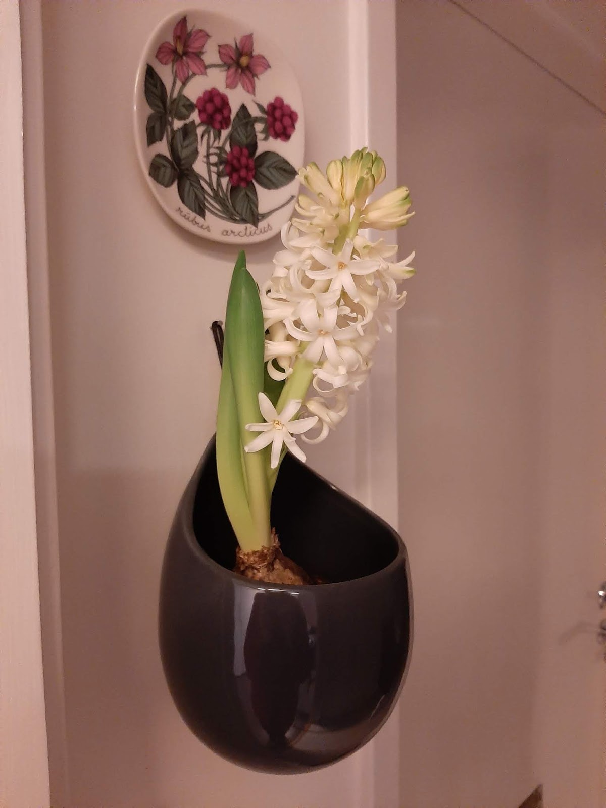 Ensimmäiset ostamani jouluhyasintit olivat tuoksuttomia, mikä minulle tuoksujen ystävälle oli pettymys. Joku tiesi kertoa, että valkoinen hyasintti ei tuoksukaan – oletko sinä kuullut/todennut sen? Keksin näille kivan paikan seinältä. Istutin kaksi hyasinttia Jyskistä ostamiini ruukkuihin. Valkoinen tulilatva sai paikan isoäidiltä peritystä fasaani-kulhosta. Niin kaunis että!