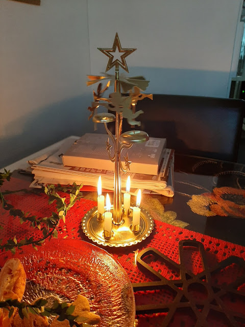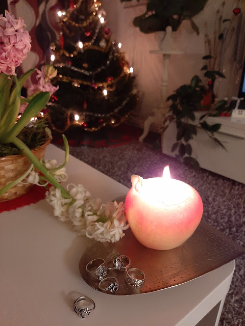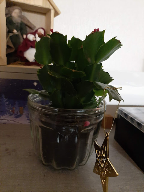 Ostin myös joulukaktuksen, jossa oli erityisen kauniin väriset kukat. Mutta ne kukinnot tippuivat jo ennen joulua ja ilmeisesti nuo nuput eivät aukene ollenkaan. Muistin ostaneeni kesällä kirpparilta enkelikellon ja löytyihän se. Vieno kilkatus tuo mieleen lapsuuden joulut. Nyt on vaan löydettävä jostain sopivat kynttilät.