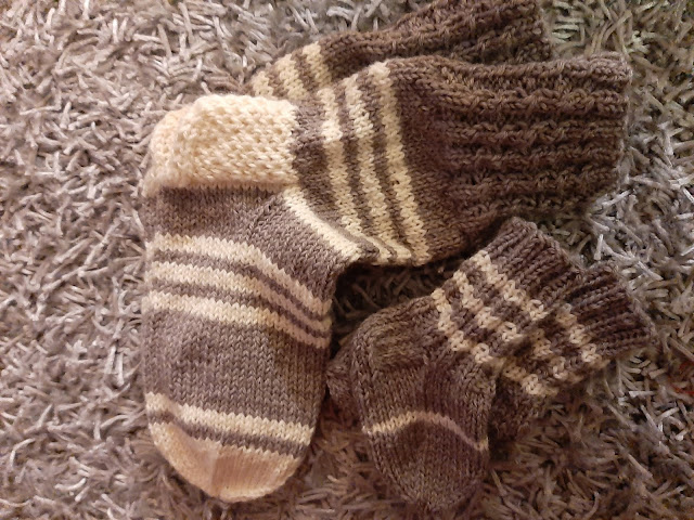 Siinä ne ovat, kivat sukat vaikka äidille ja vauvallensa. Ihan mukava tehdä välillä paksusta langasta nopeasti. Ja on se kiva välillä päättää itse, miten raidoittaa – tai raidoittaako ollenkaan. Näillä sukilla on sitten kiva äidin ja vauvan samistella koti-iltoina.