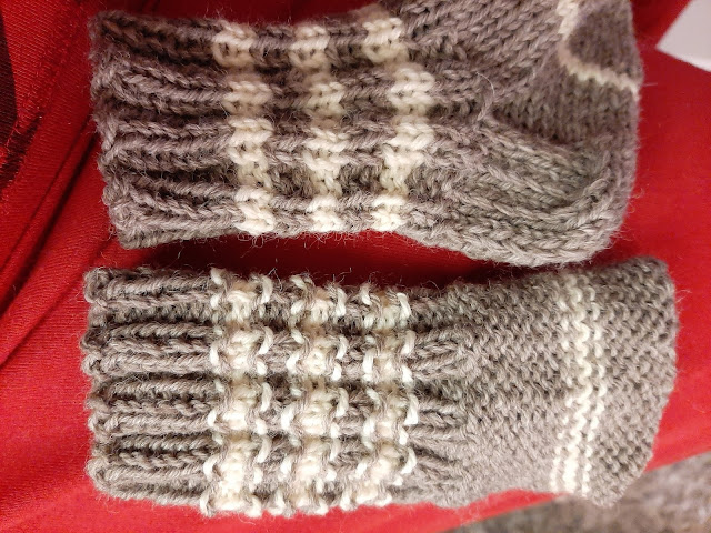 Käytin tässä hiljattain oppimaani tapaa noiden raitojen neulomiseen: ensimmäinen rivi tehdään aina oikeaa, niin nurjat silmukat eivät ”riko” reunaa. Huomasin, että nurjalle puolelle tuli ihan kiva kuvio… Tätä kikkaa kannattaa kyllä käyttää, minä vaan tosi harvoin teen raitoja, kun vaan noita valmiiksi raidoitettuja sukkia…