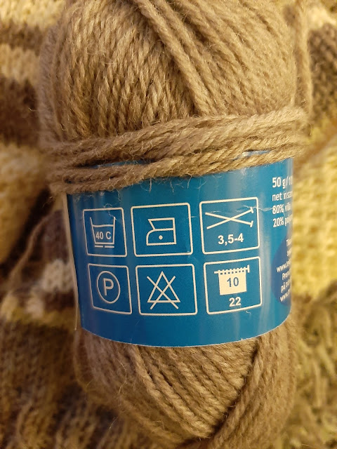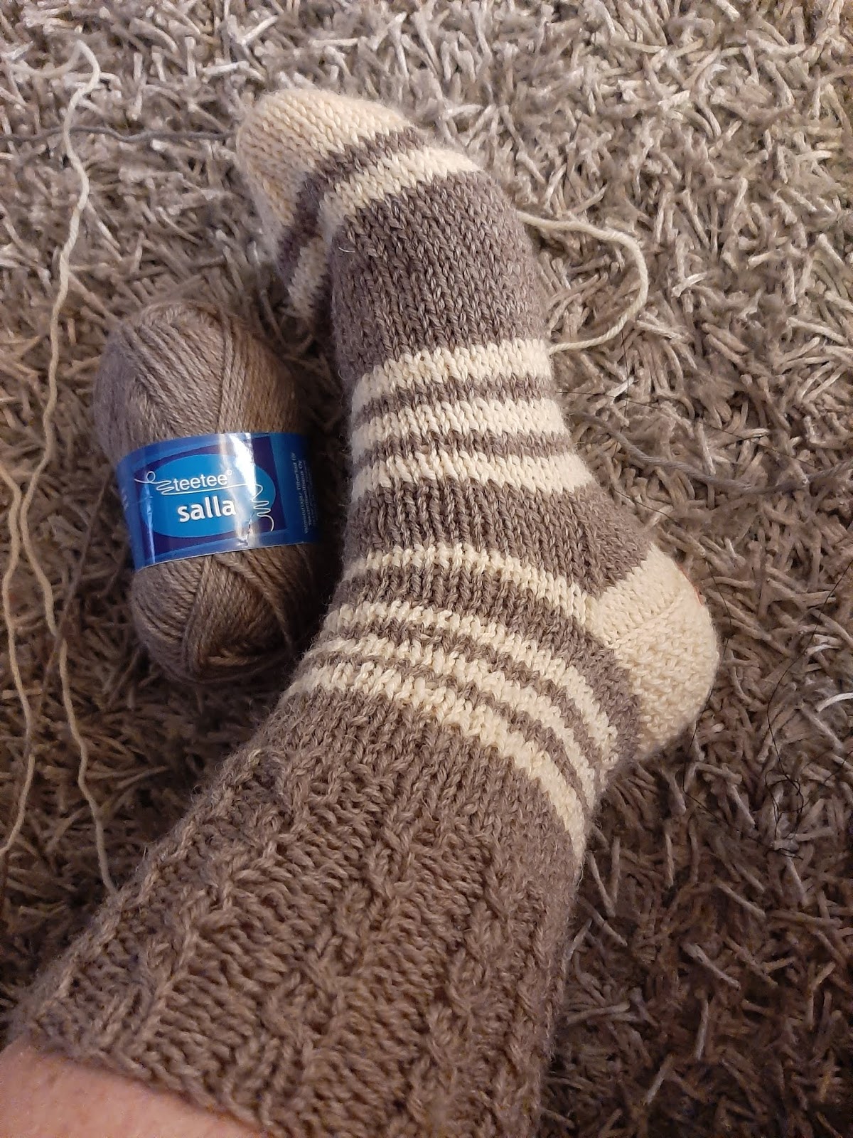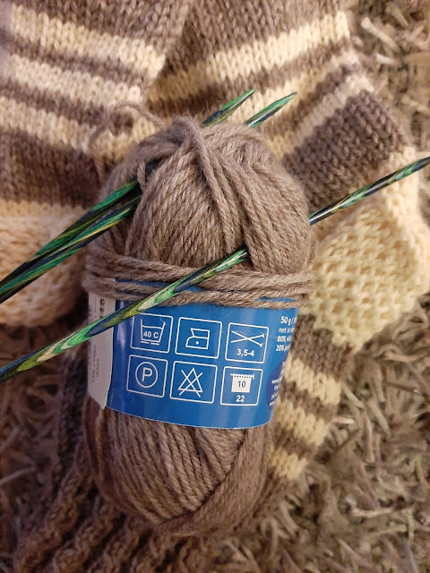 Vaaleanruskea-valkoinen sukanaloitus löytyi keskeneräisten koristani. Olin suunnitellut siitä pitkät polvisukat ja jopa jonkinlaisen kirjoneuleenkin aloittanut. Koska kirjoneule ei minun käsissäni onnistu ja ohjekin oli hukassa, olin minäkin hukassa. Pyörittelin aikani keskeneräistä vartta ja vaikka kaikenlainen purkaminen sieluani särkeekin, niin purin resoriin asti. Päätin tehdä tavalliset, nopeatekoiset sukat, joita tehdessä voi katsella telkkaria samalla.