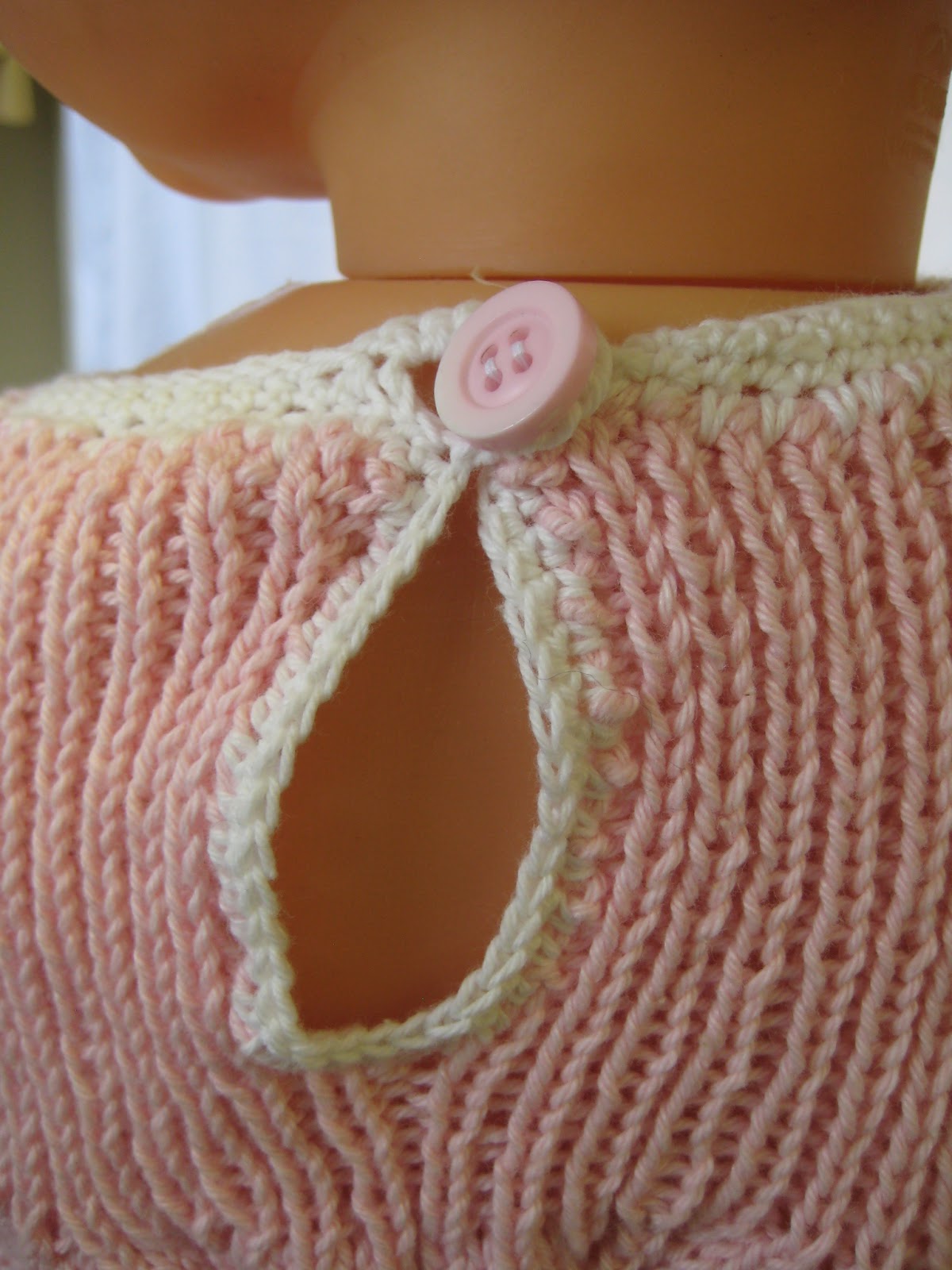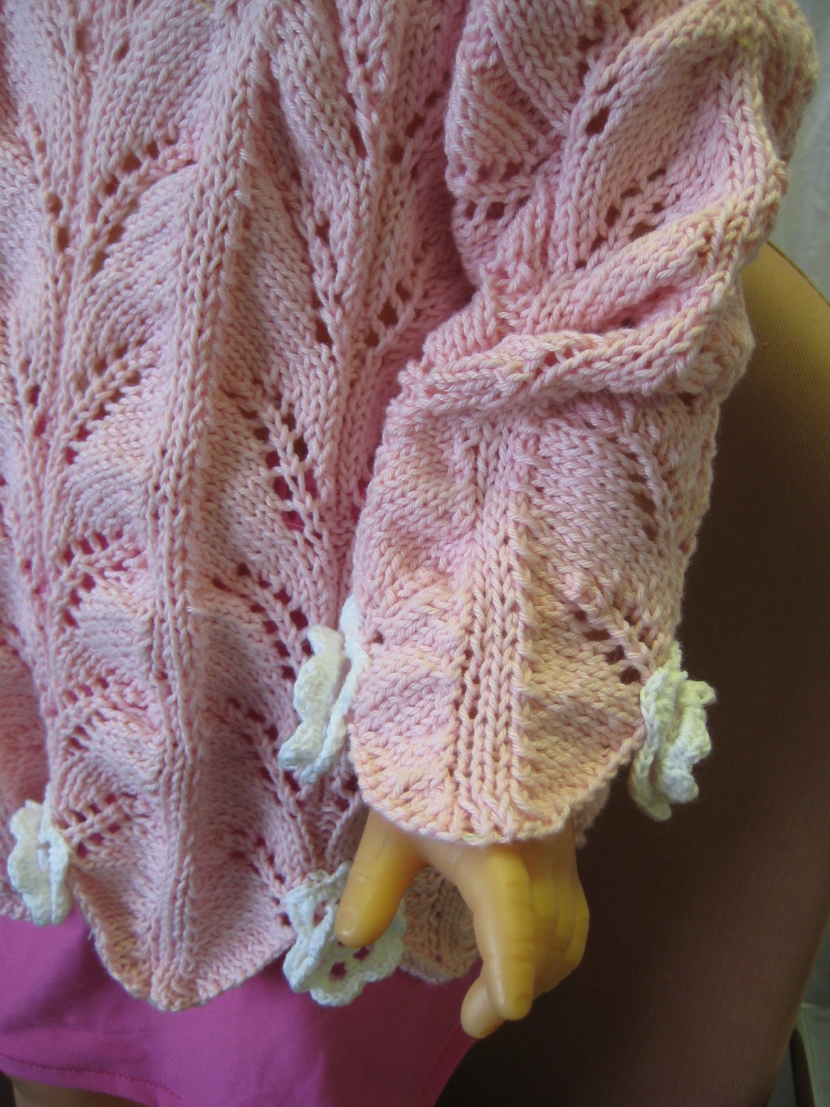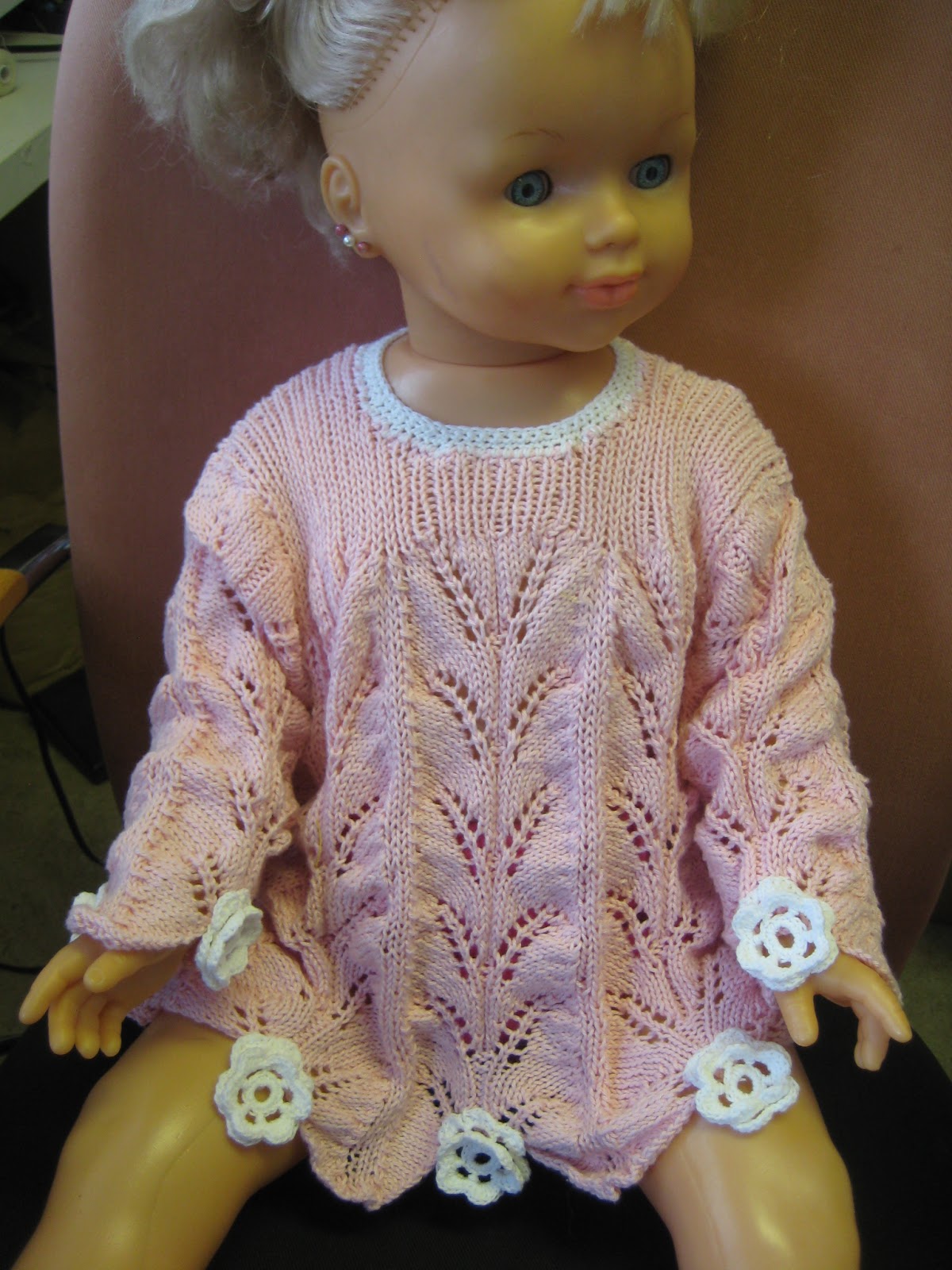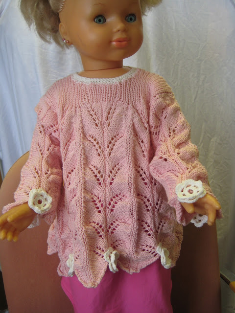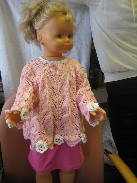 Onhan tässä puserossa ollut kova työ, sillä tuo lanka on kovin ohutta. Lehdessä tämä malli mainitaan kasteasuksi ja pienellä vauvalla tuo meneekin ensin mekkona ja myöhemmin lapsen kasvaessa puserona. Meidän mallimme taitaa olla parivuotias? Hihat tässä on kylläkin aika pitkät, ehkä vauvalle pitäisi keksiä joku kuminauhajuttu…
