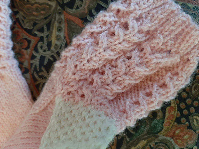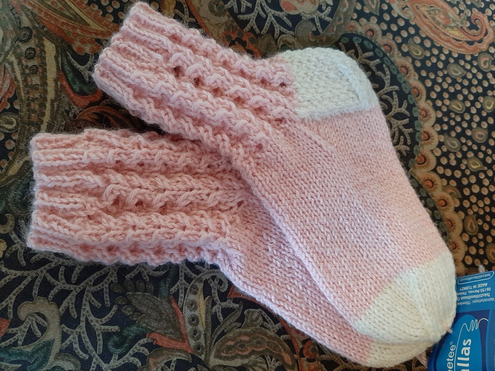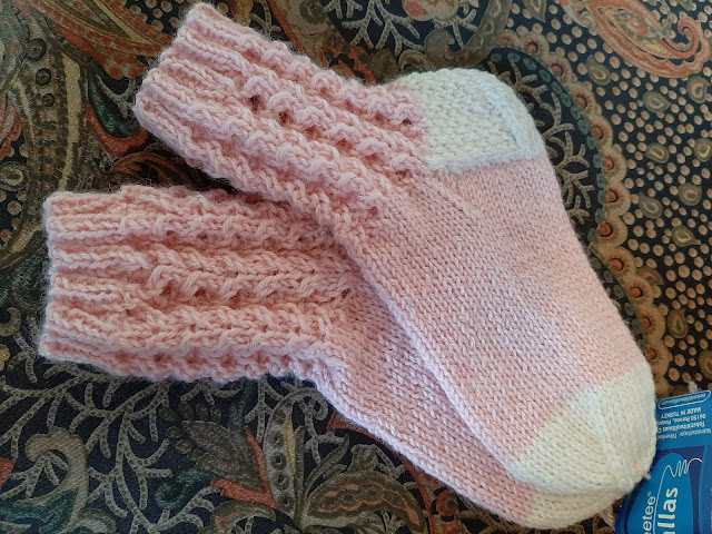 Vaikkakin ovat ihan eri langasta kudotut, niin mainiosti sopisivat kaveriksi nämä aiemmin Pallaksesta neulomani sukat.