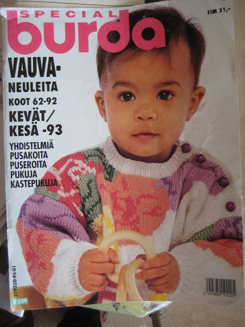 Minun lapseni ovat jo aikuisia, ne kaksi tyttöä, jotka puin pienenä pitsiin. Silloin ei ollut facebookia eikä Pinterestiä, vaan käsityöideat otettiin lehdistä ja kirjoista. Tämä Burdan vauvaneule -lehti vuodelta 1993 on aika resuiseksi käytetty. Melkein jokaisen mallin olen aikoinaan siitä neulonut.