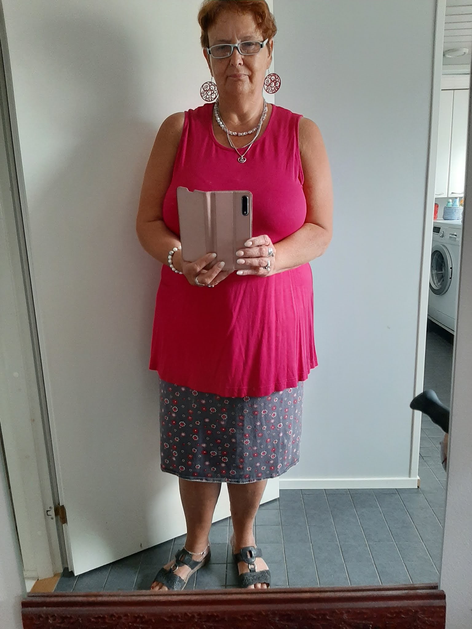 Keväällä ostin monta mekkokangasta, mutta en ole ommellut kuin yhden. Kun kaappi on pullollaan vaatteita, tuntuu turhalta tehdä niitä lisää. Tämän puolihameen olen ommellut ainakin viisi vuotta sitten ja saman ajan se on ollut pitämättömänä, mutta nyt hoksasin tällaisen yhdistelmän ja tuntuu olo ihan naiselliselta ainaisten housujen jälkeen. Puseroa olisi saanut vähän silittää ja hameen helmakin näyttä kipristyvän. Noooh.