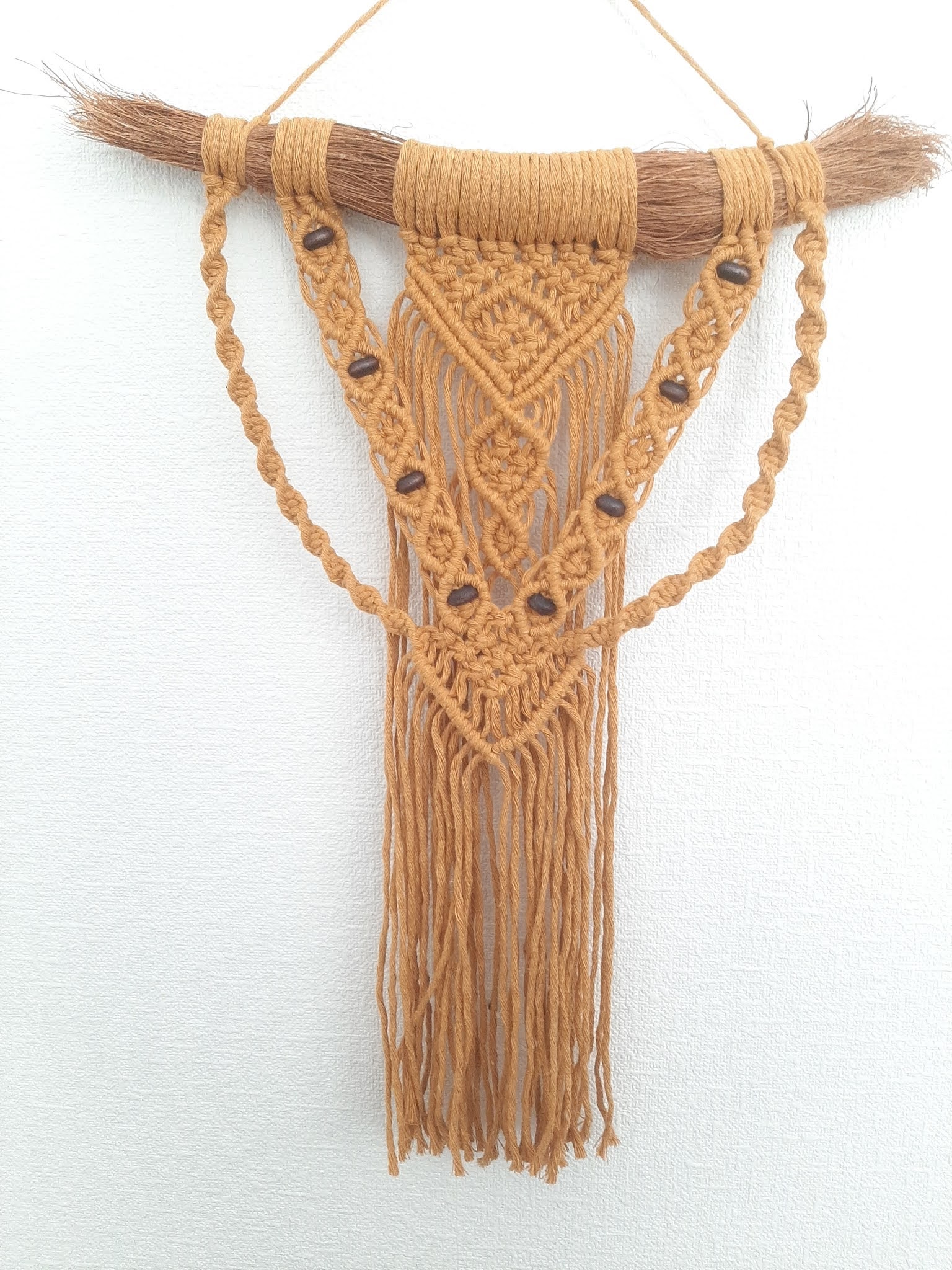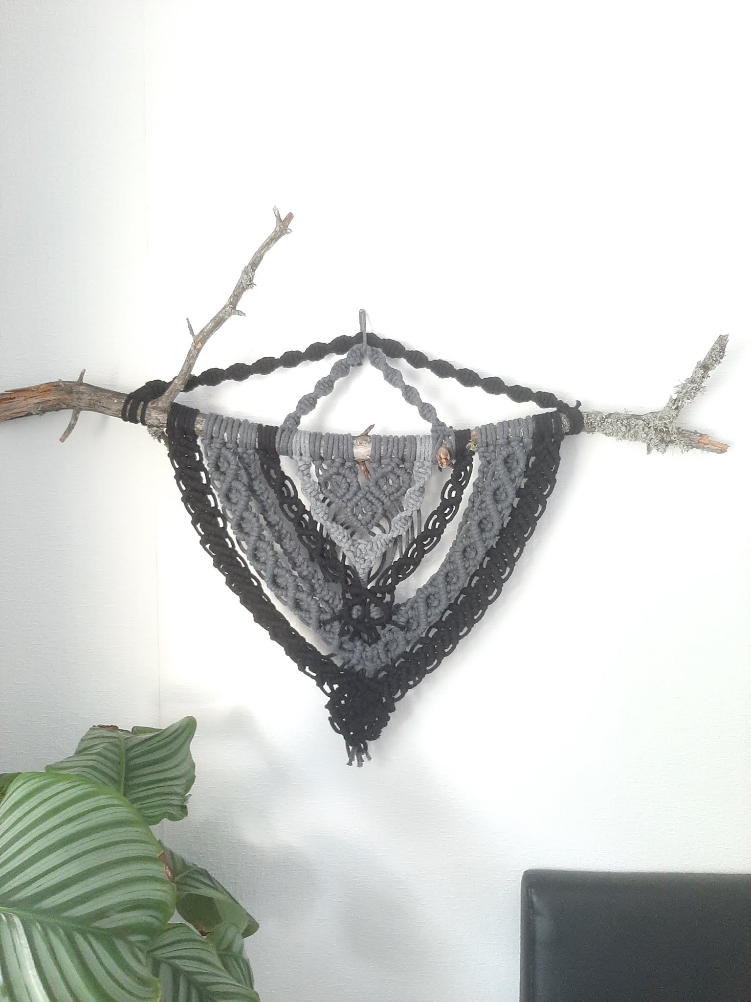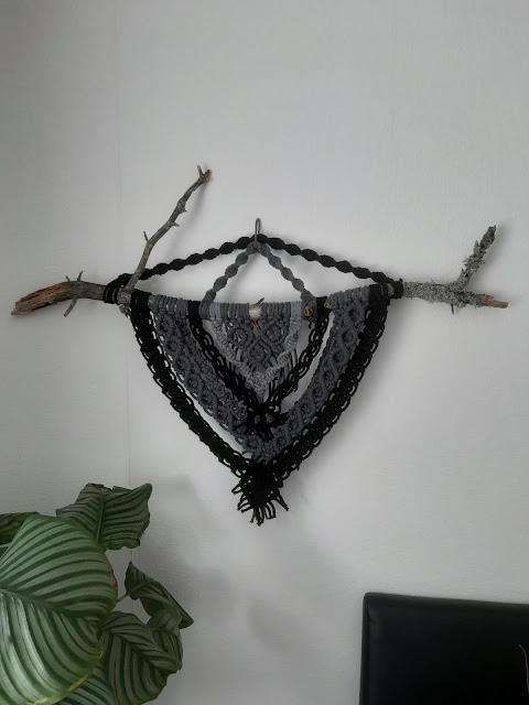 Näytän vielä yhden työni, aika näyttävä, vai mitä… Tähän kokeilin erilaista ripustussysteemiä. Solmin tuollaiset spiraalit pelkkien narujen tilalle. Näyttää minun silmääni hyvinkin ”täyteläiseltä”.