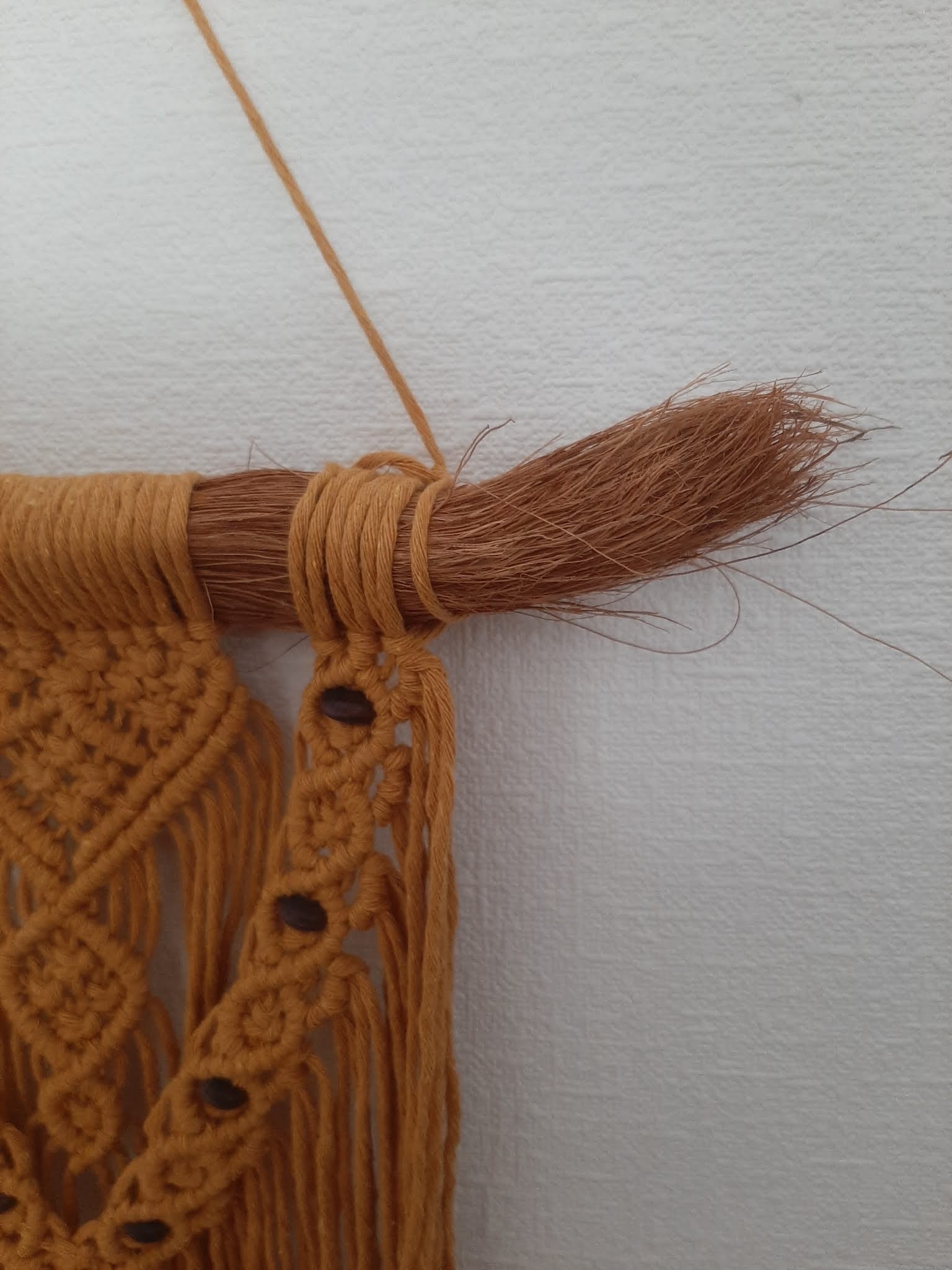 Muistin, että minulla on jemmassa – myynnissäkin – tosi vanhoja harjantekotarpeita. Löysin kauan sitten kierrätyskeskuksesta laatikon (jossa oli vielä VR:n lähetyslappukin mukana) sisältäen jouhia tai juurakoita, mitä lienevätkään, lähetettynä uusikaupunkilaiselle sokealle harjantekijälle. Niitä on kahta väriä ja nyt valitsin tämän syksyyn sopivan okran värin. Siihen väriltään sopiva makrameelanka on Lankavan Minimoppia. Ensin se tuntui liian ohuelta, mutta on oikeastaan just passeli pieneen työhön.