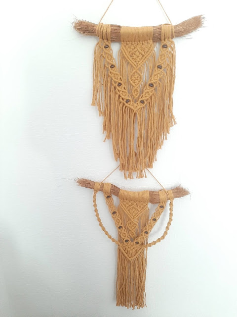 Olen tehnyt näitä makrameetöitä sekä bohotyylillä hapsujen kanssa että ilman. Tässäkään en ollut ihan varma, kumpi on kivampi, joten tein molemmat.
