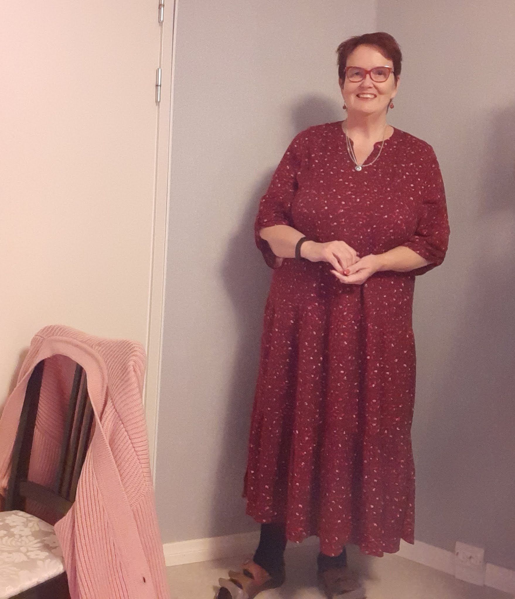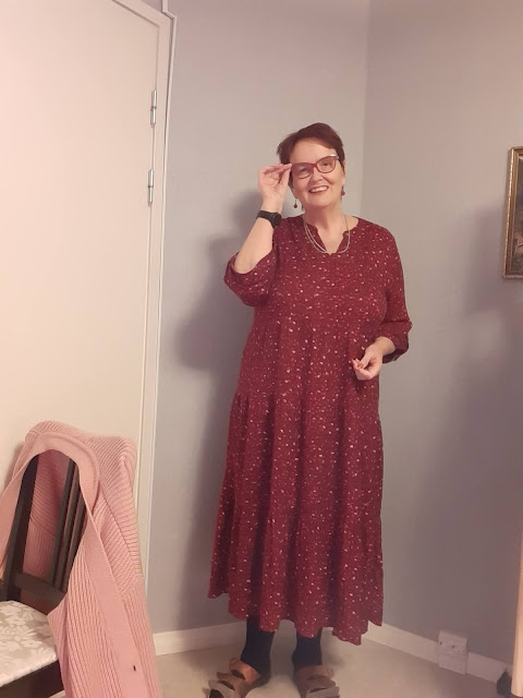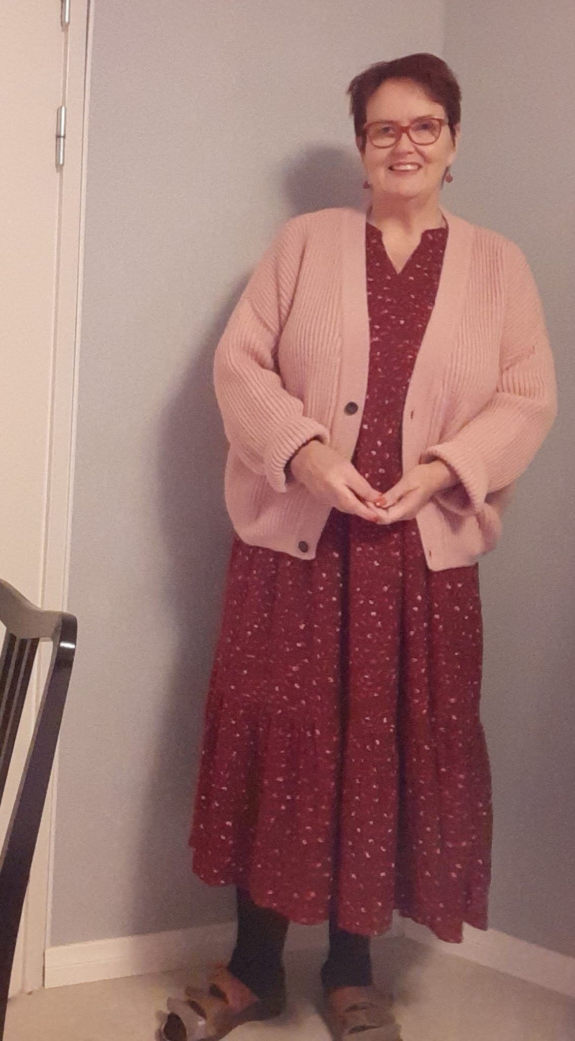 Kuvasin mekon illalla, enkä jaksanut enää etsiä toisia kenkiä. Totesin, että nämä jokapäiväiset työkengäthän sopivat väreihin ihan just. Näillä tepsuttelen (lue: laahustan) kesät talvet, sisällä ja ulkona. Pukiessani mekkoa muistin, miten paljon sain moitteita ”mummoluukista” ja mietin, että pitääpä ottaa asiakseen mekon lyhennys, mutta tänään ei ehdi…