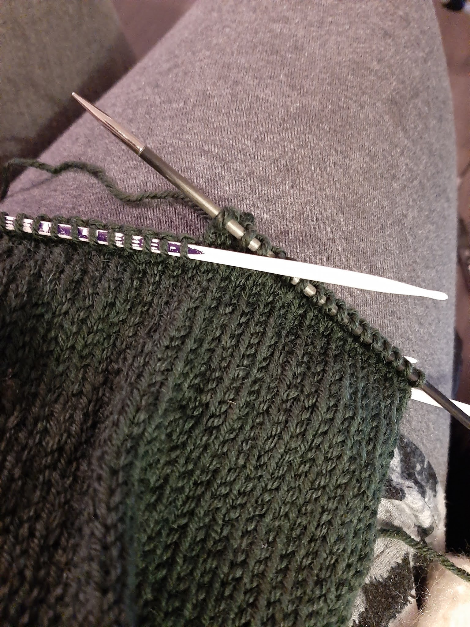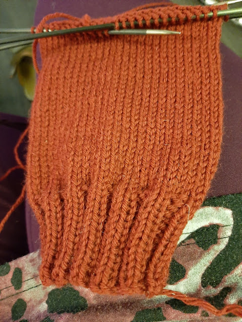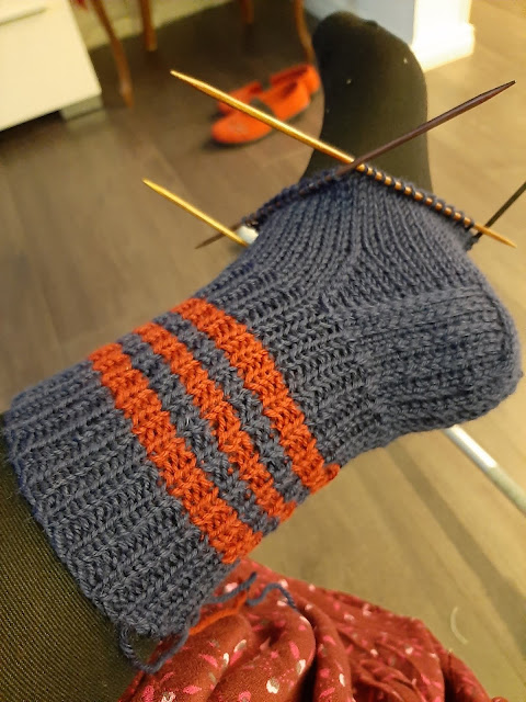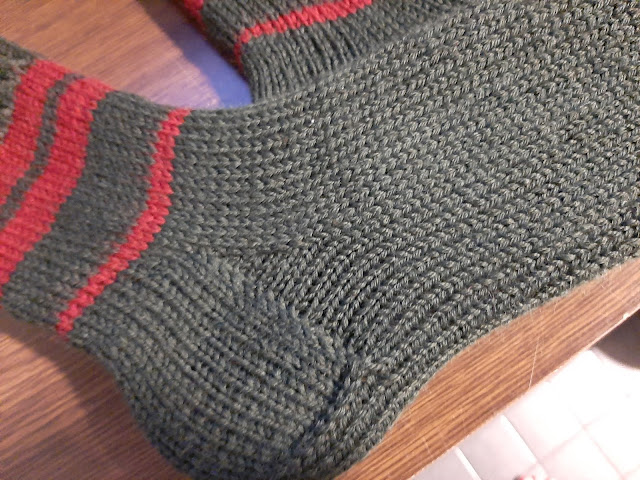 Koska en tykkää tehdä resoria (koska en saa kaikkia silmukoita yhtä kapeiksi!) niin teen resorista vain ihan kapean ja muun varren sileää oikeaa. Joihinkin sukkiin tein puolipatentti -kantapään, toisiin ristiinvahvistetun, mutta alla olevassa ei ole laisinkaan vahvistettua. Joku paljon sukkia kutonut sanoi, ettei sillä vahvistuksella ole mitään merkitystä, kestävät kuulemma yhtä hyvin tavallisenakin.