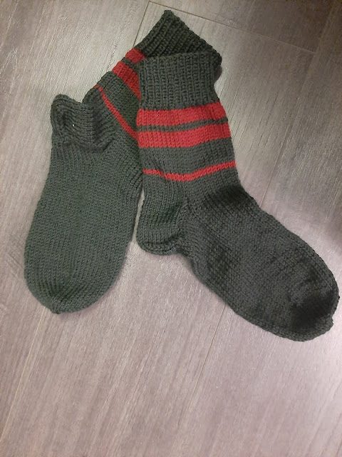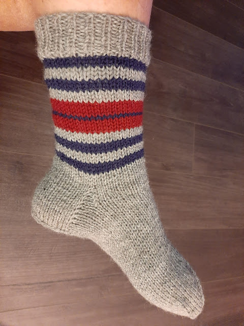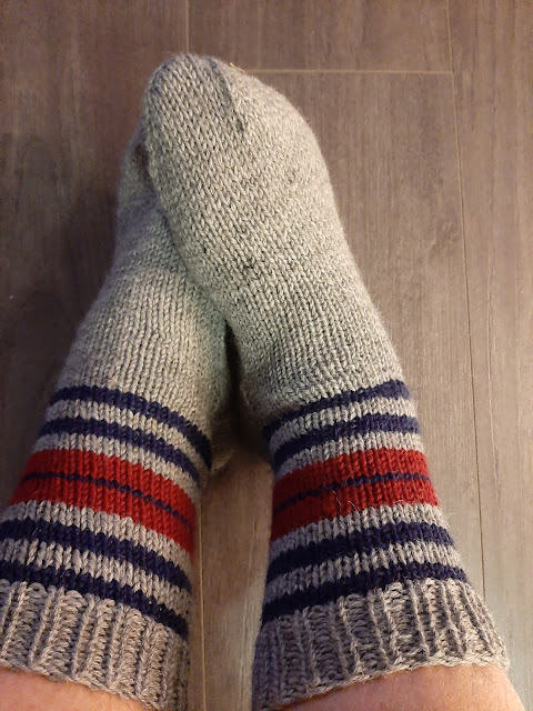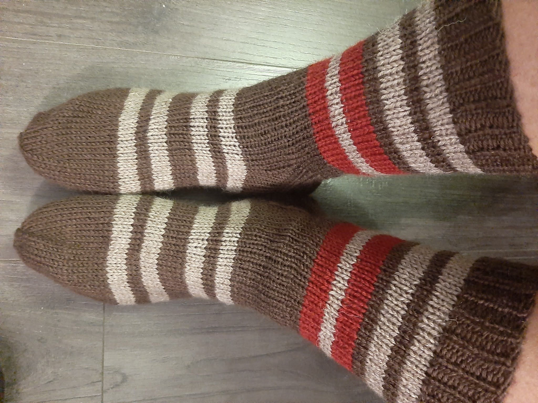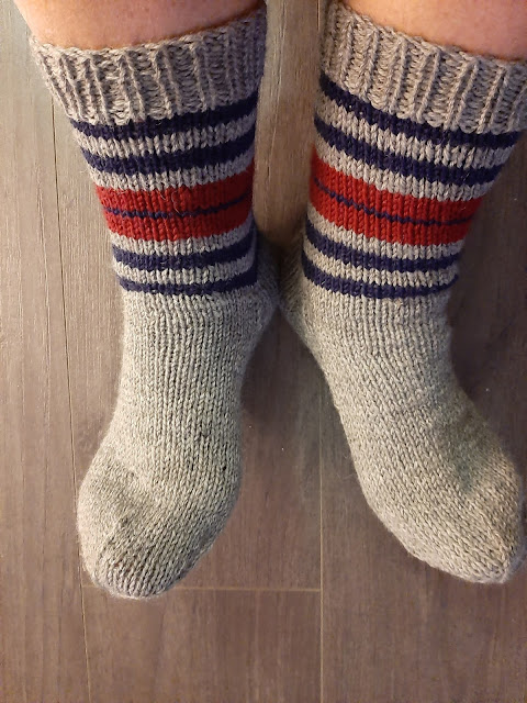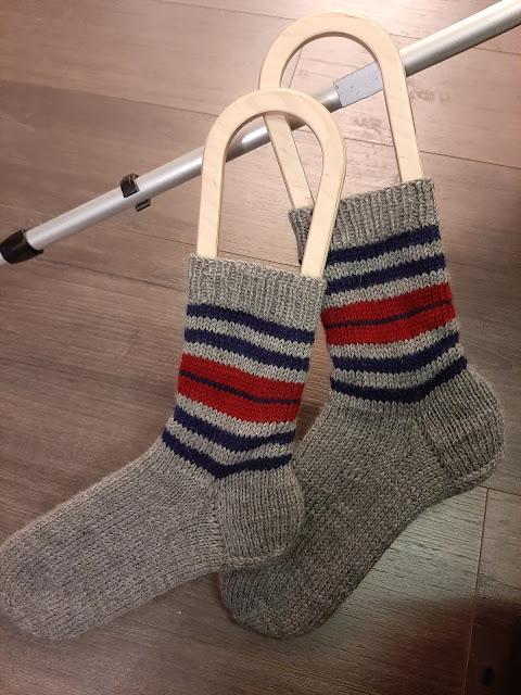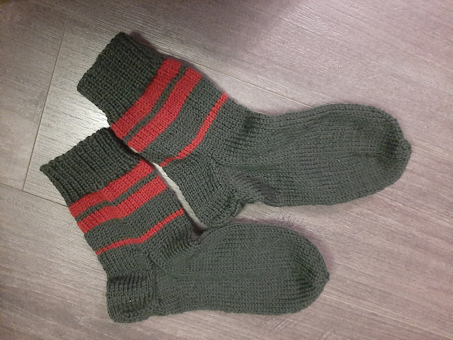 Tästä innostuin tekemään muitakin miesten sukkia paksusta langasta, tulevathan ne nopeasti valmiiksi! Ja oli ihan kiva suunnitella omat raidat. Näihin laitoin lyhyemmät varret.