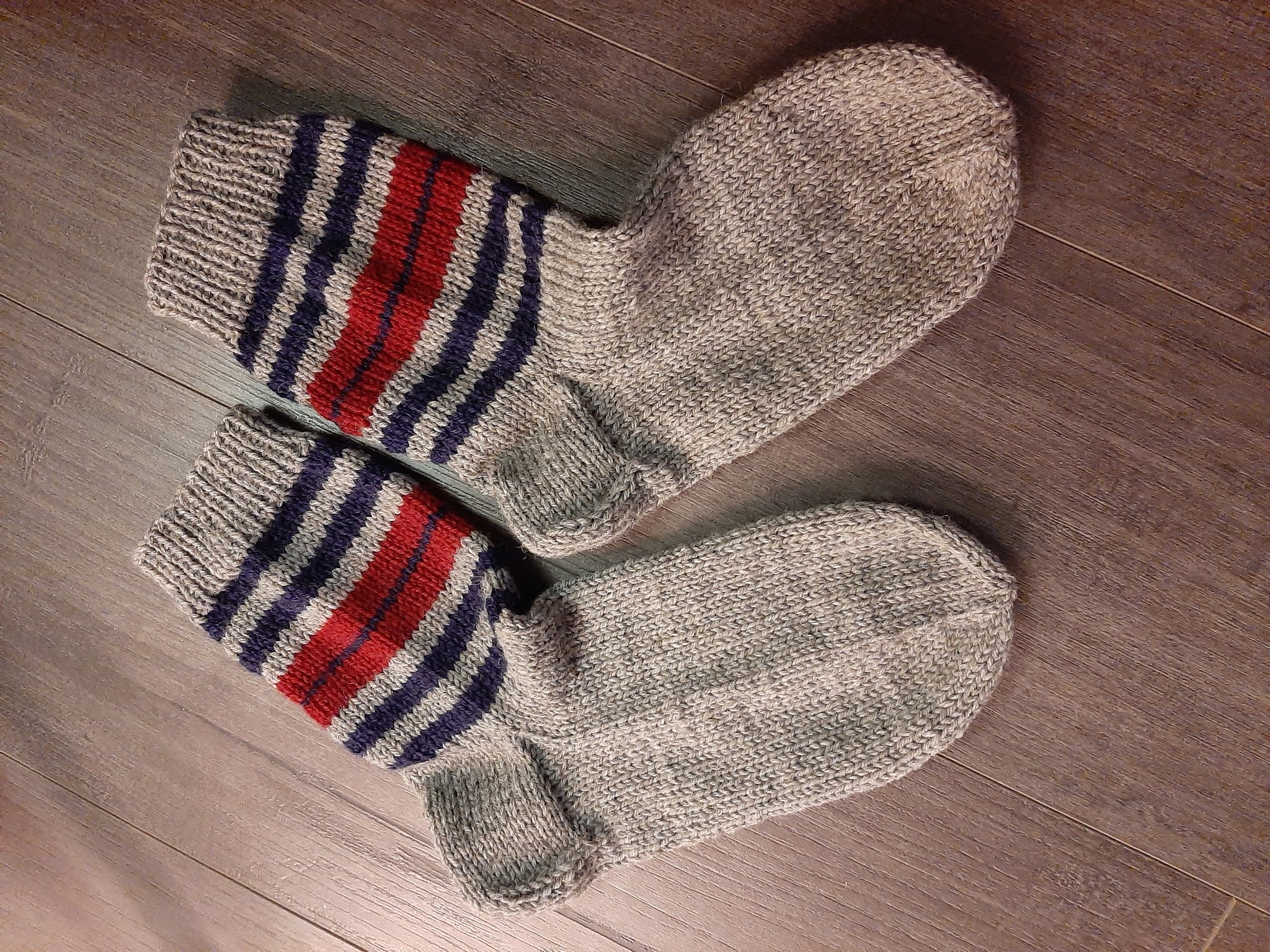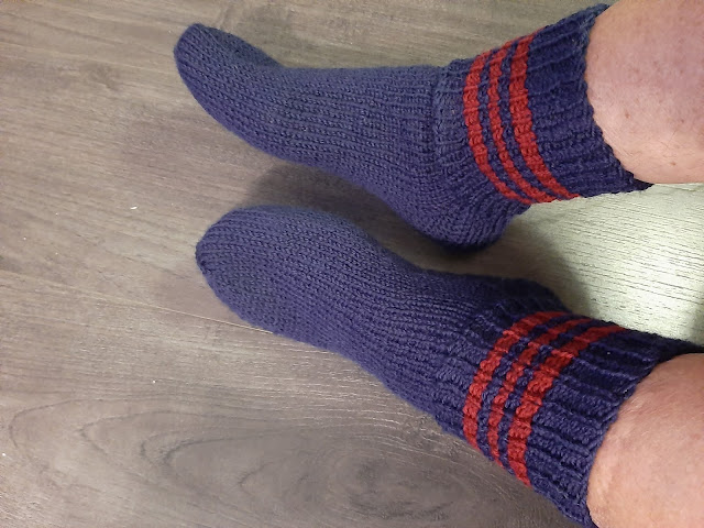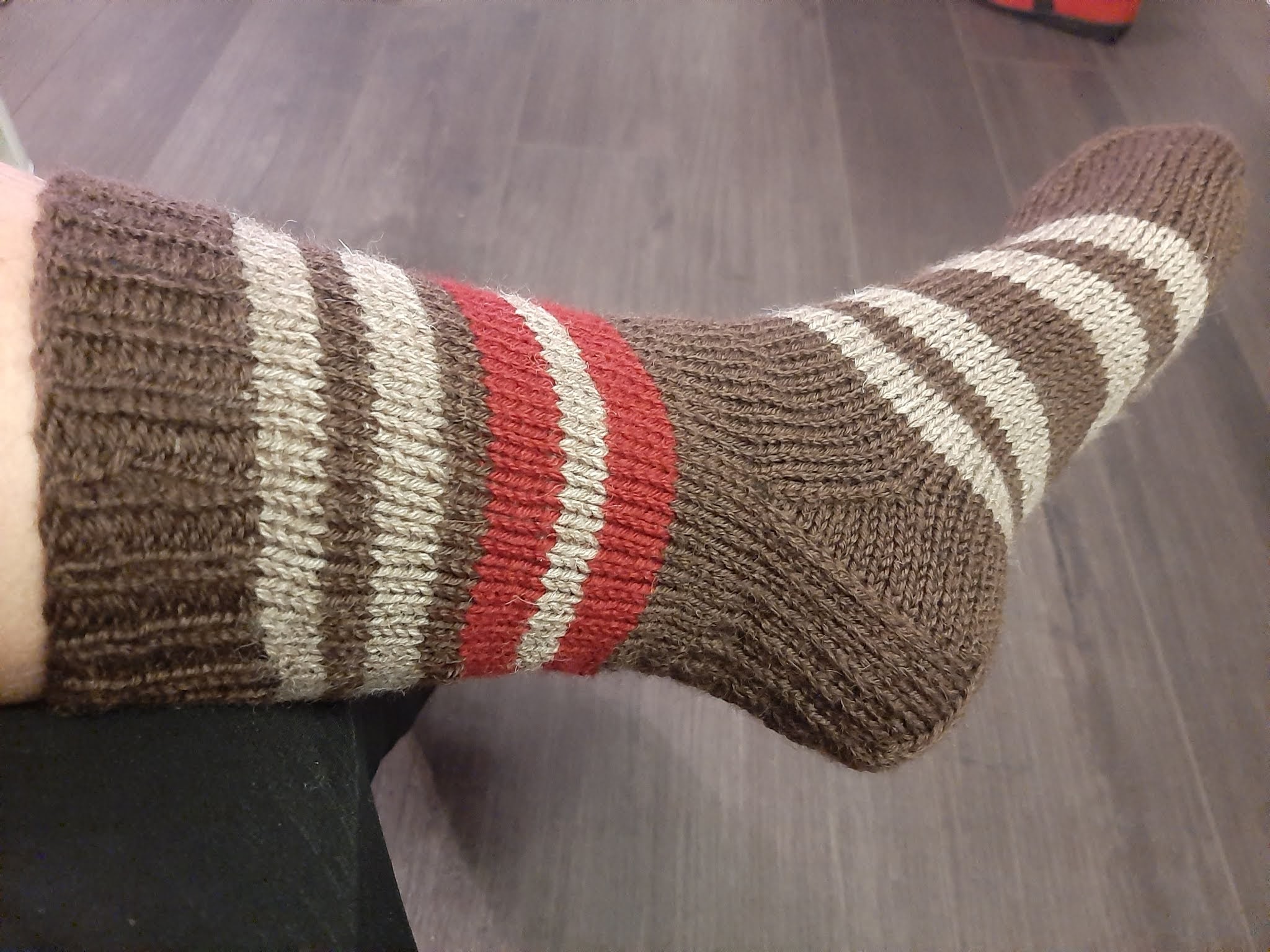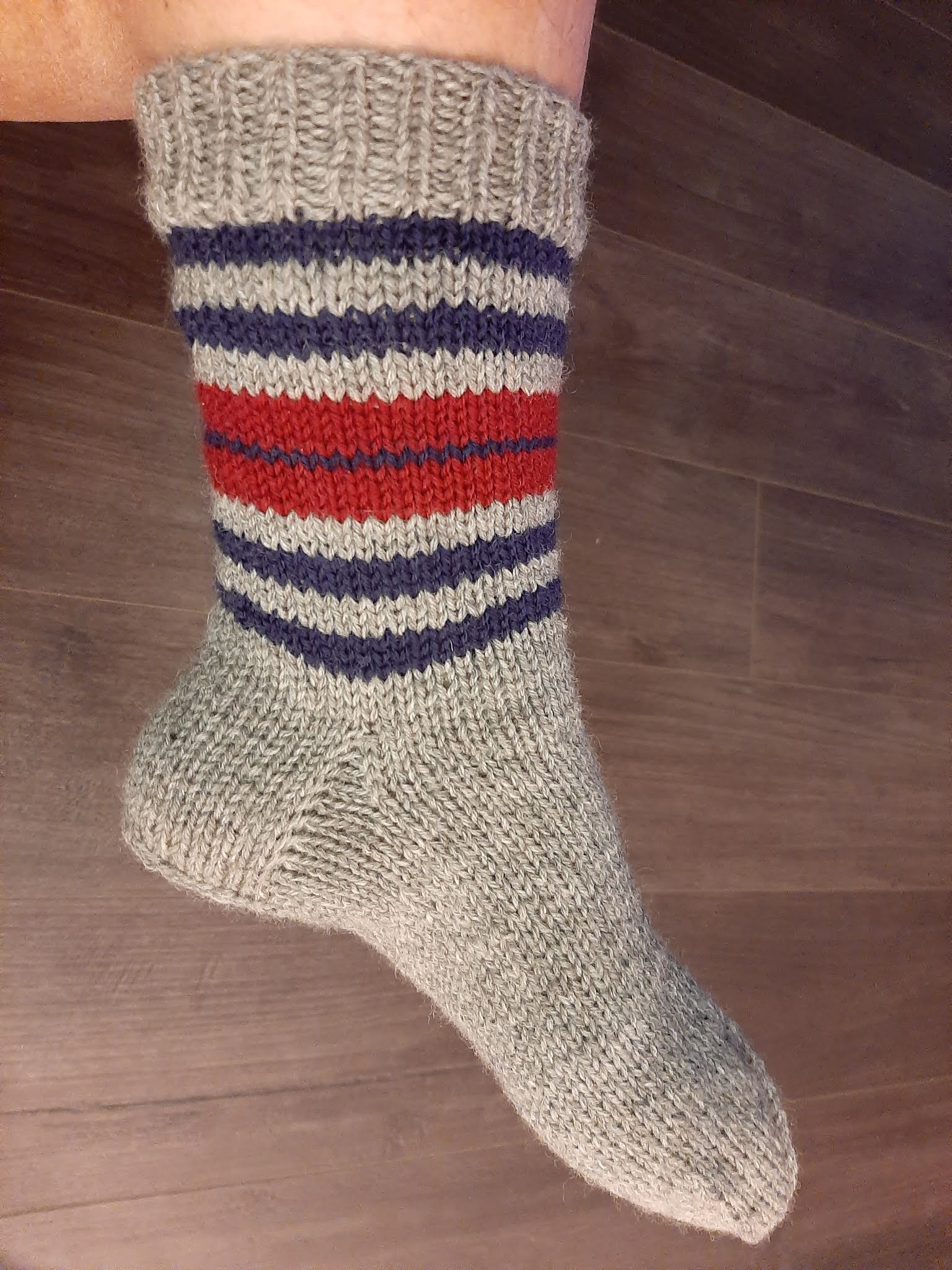 Tästä innostuin tekemään muitakin miesten sukkia paksusta langasta, tulevathan ne nopeasti valmiiksi! Ja oli ihan kiva suunnitella omat raidat. Näihin laitoin lyhyemmät varret.