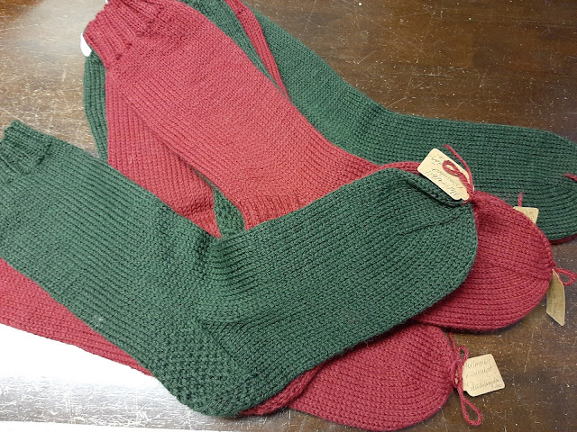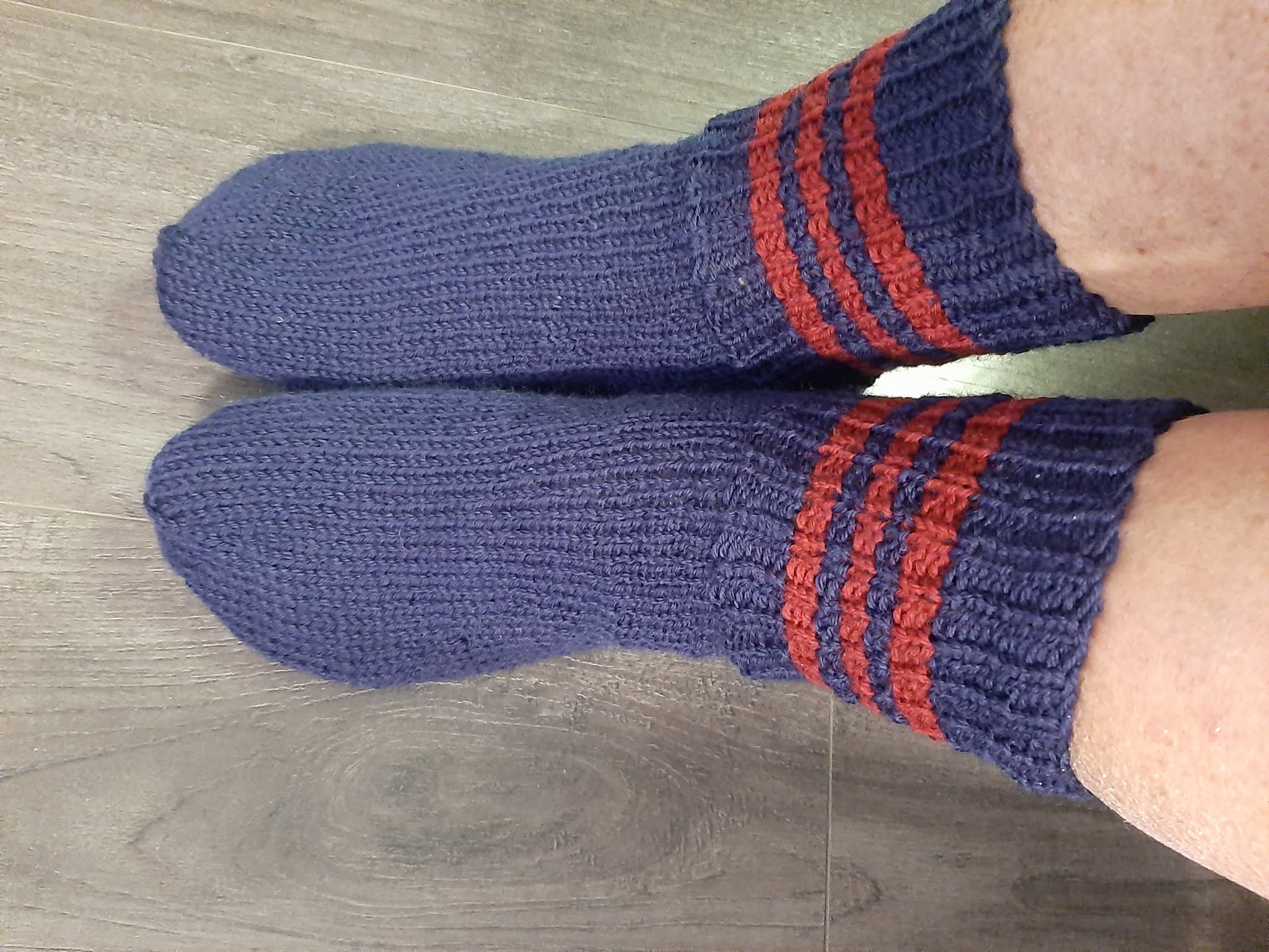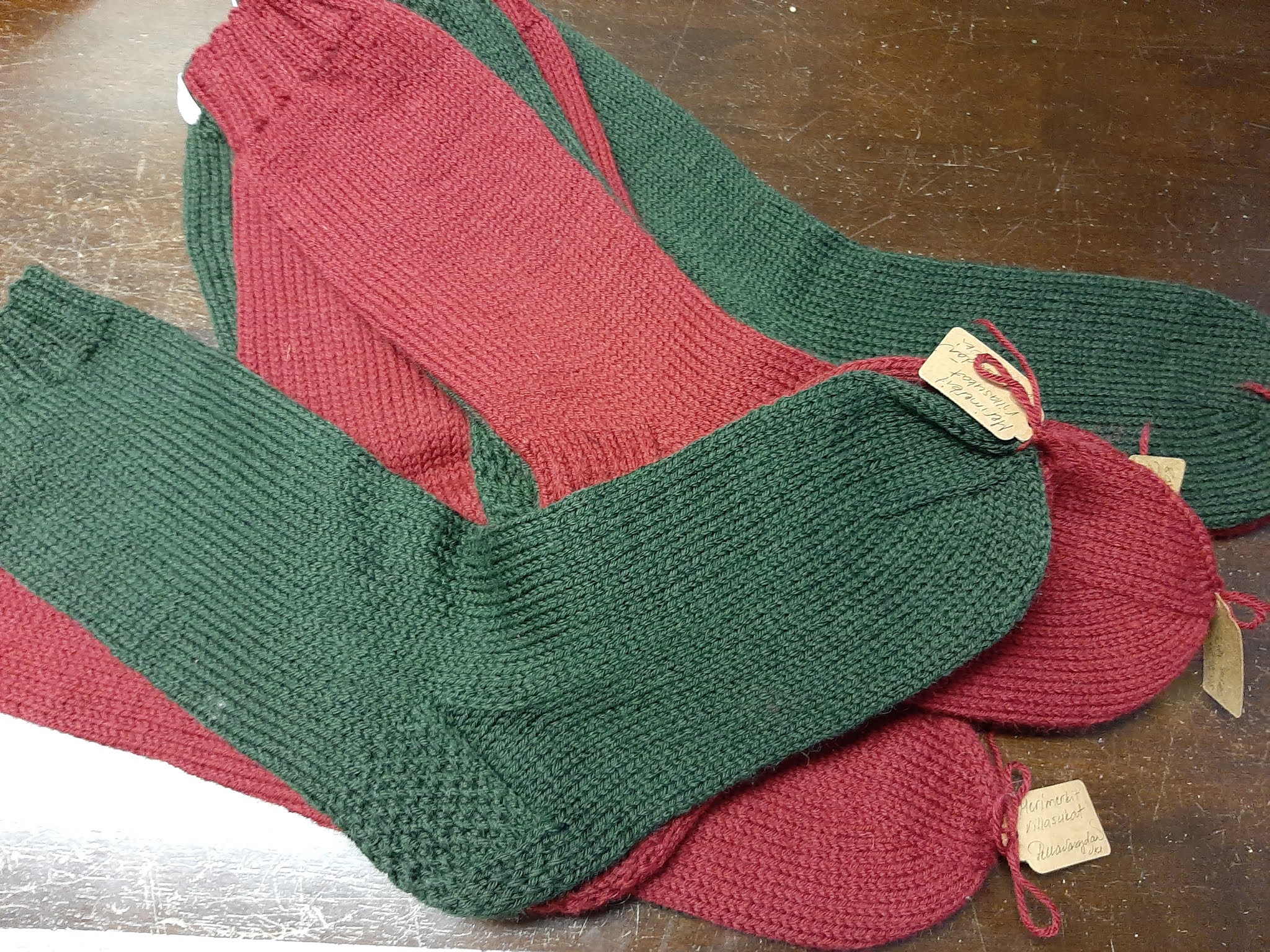Olen kuuden vuoden ajan – niin kauan, kuin mulla on ollut lankakauppa – neulonut sukkia pelkästään kirjavista langoista, koska olen halunnut näyttää asiakkaille, minkälaiset sukat kustakin langasta ja väristä tulee. Paitsi nyt. Tuli tilaus yksivärisistä paksuista miesten sukista. Asiakas halusi ”merimerkit” – sukat, eli toinen sukka punainen ja toinen vihreä. Neuloin 5 paria Teeteen Salla-langasta. Alkoi muuten loppuvaiheessa jo puuduttaa ja tuntua TYÖLTÄ. Miesten pitkävartisen yksivärisen sukkaparin neulomiseen meni n. 9 tuntia.