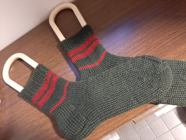 Harmittelin sitä, että langat olivat erilaisia tuntumaltaan. Vihreä oli olevinaan ohuempaa ja aavistuksen ”kikkaraisempaa” kuin punainen. Ongelma kuitenkin ratkesi sillä, että kastelin sukat läpimäräksi ja kuivatin ne sukkaplokin päällä. Näin toimien valmis pari on samanlainen.