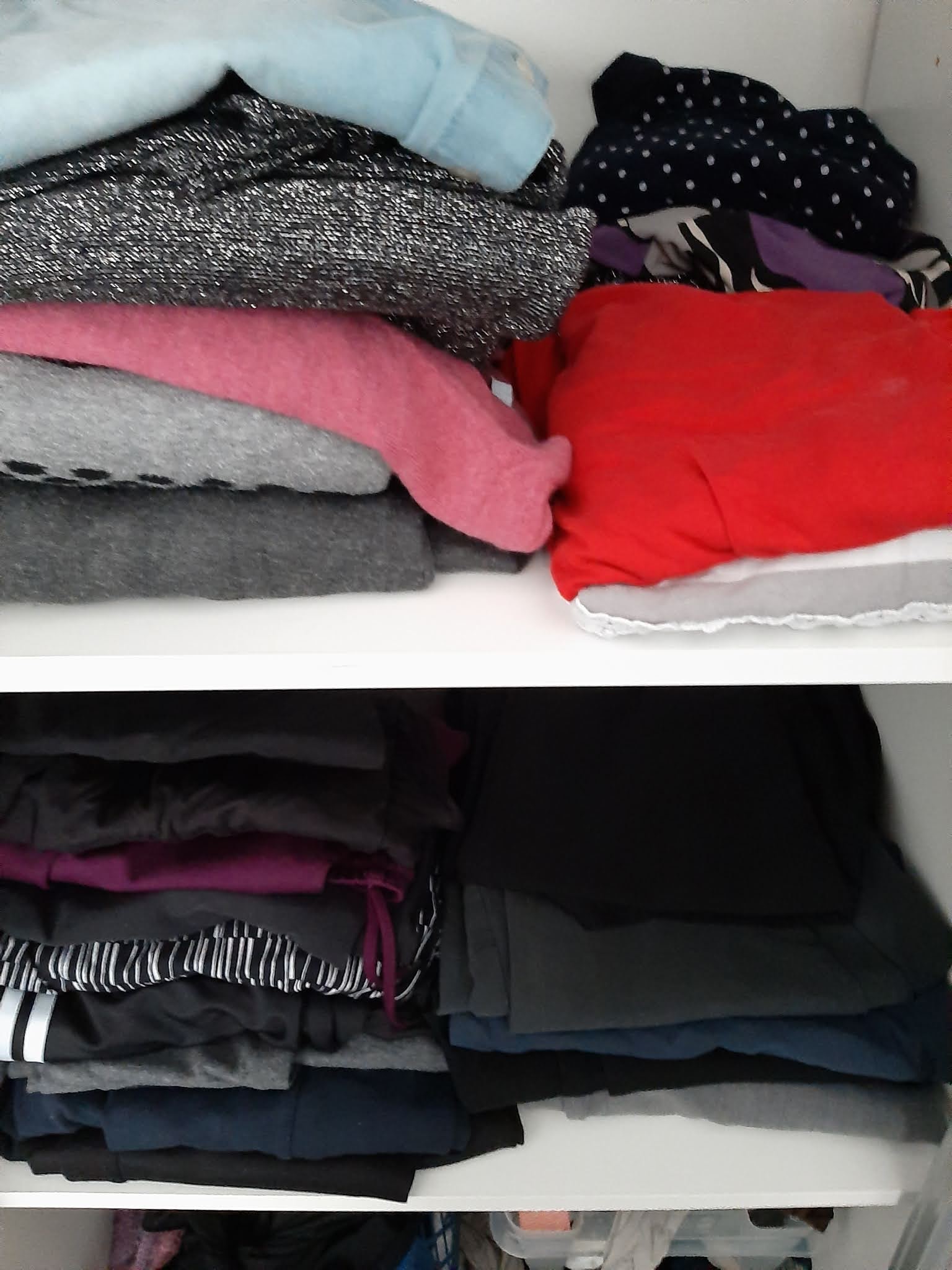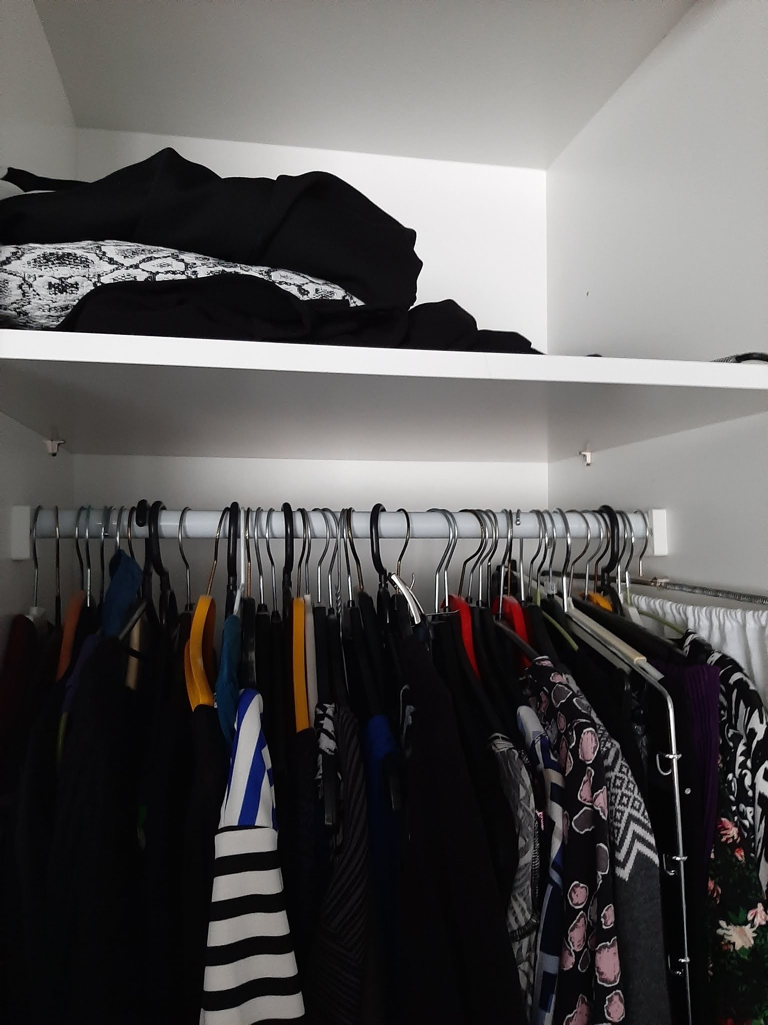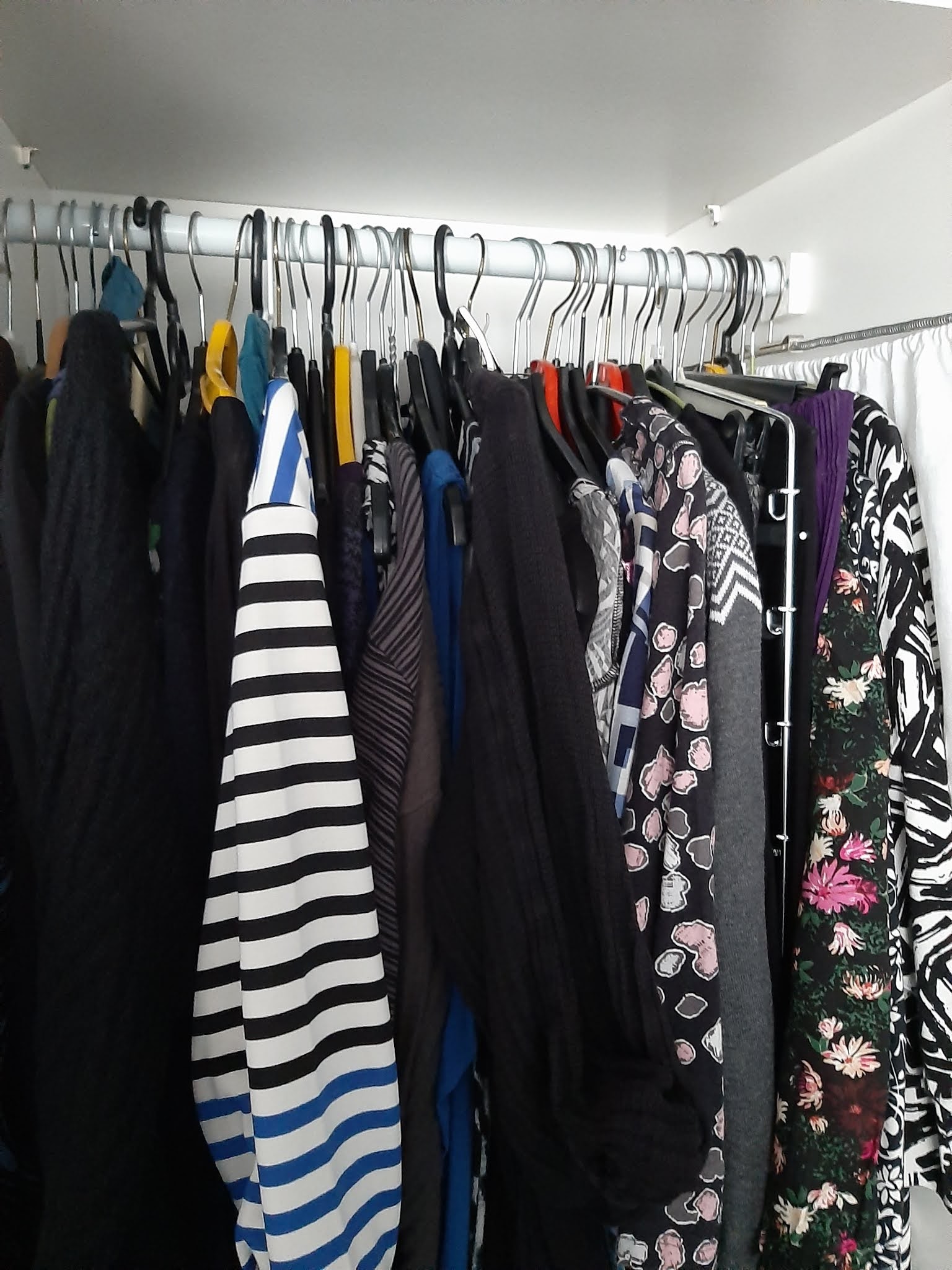 Aloitimme haasteen avustajan kanssa jo aamulla ja useampi tunti siinä vierähtikin. Kävimme jokaikisen vaatekappaleen läpi ja aika monet sovitinkin ylleni. Liian pienet, liian isot, epämukavat ja väärän väriset lähti hyvin pienellä kynnyksellä kiertoon. Onneksi oli toinen silmäpari apuna; itse olisin ehkä ollut säästäväisempi.