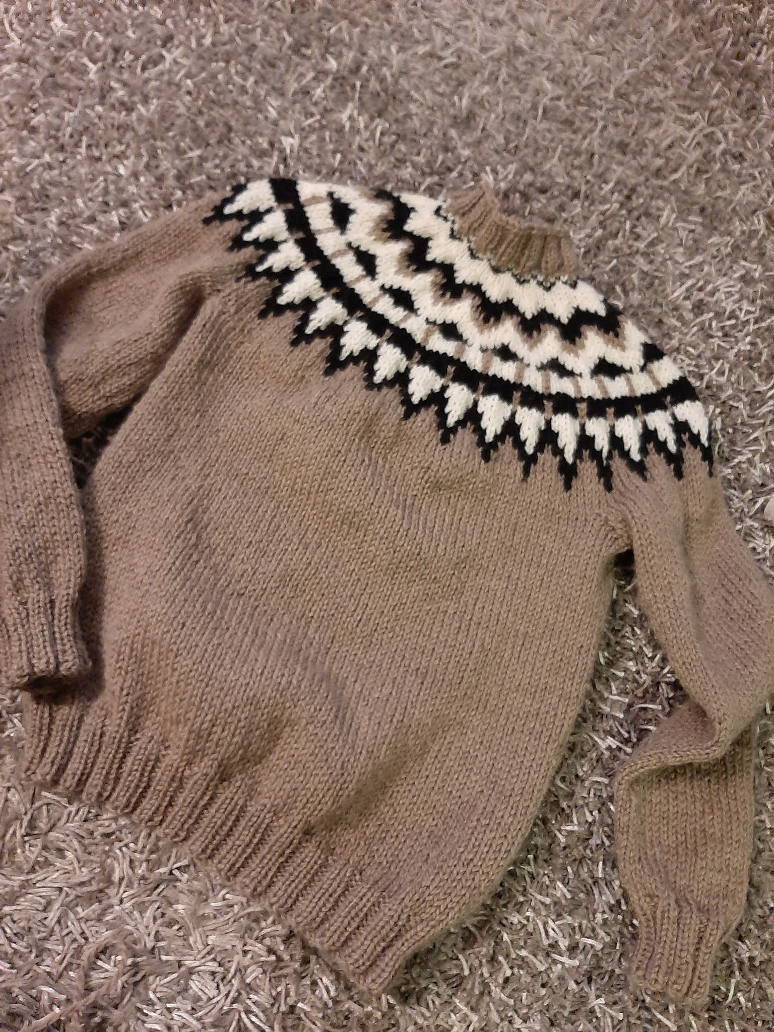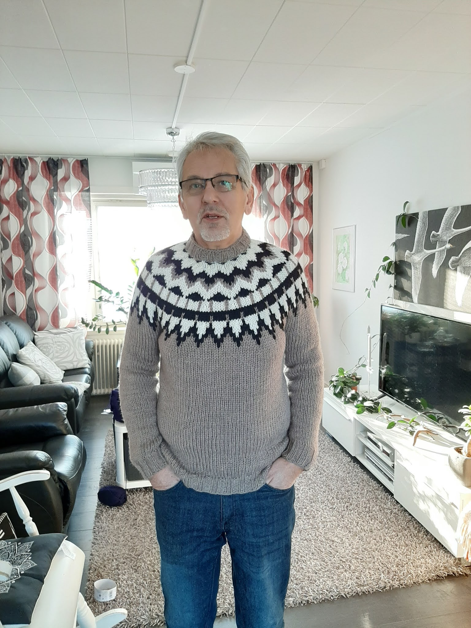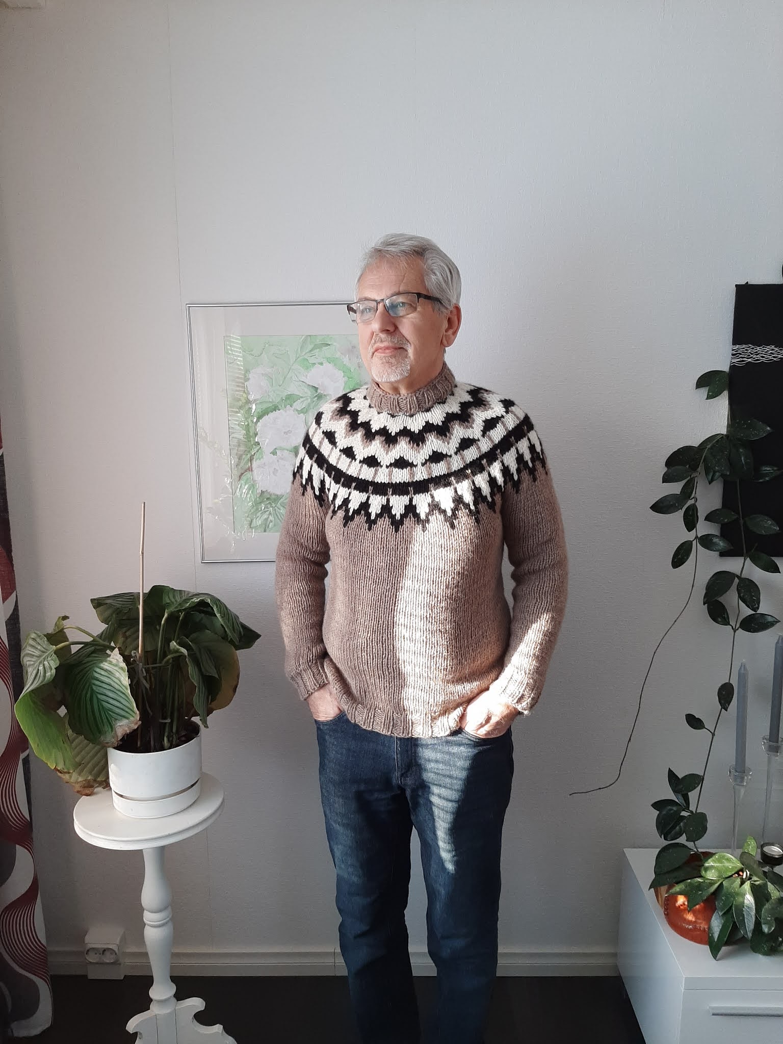 Islantilaisten neulepaitojen suosio on ollut uskomatonta. Minunkin puodissani se on näkynyt lankojen ja puikkojen jatkuvana virtana… Olen joutunut toteamaan asiakkailleni, etten itse osaa kirjoneuletta tehdä. Tämä tietysti kolauttaa itsetuntoon ja niinpä ”otin härkää sarvista” ja yritin. Tai oikeastaan siinä kävi hassusti: jo viime talvena aloitin islantilaset neuleet -kirjasta villatakin neulomisen, mutta rohkeus petti, kun olisi pitänyt kaarroketta ruveta tekemään. Olen siis esitellyt tätä puoliväliin tehtyä neuletta. Ja sellaisena se ehkä pysyykin tai ehkä puran…?