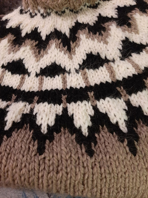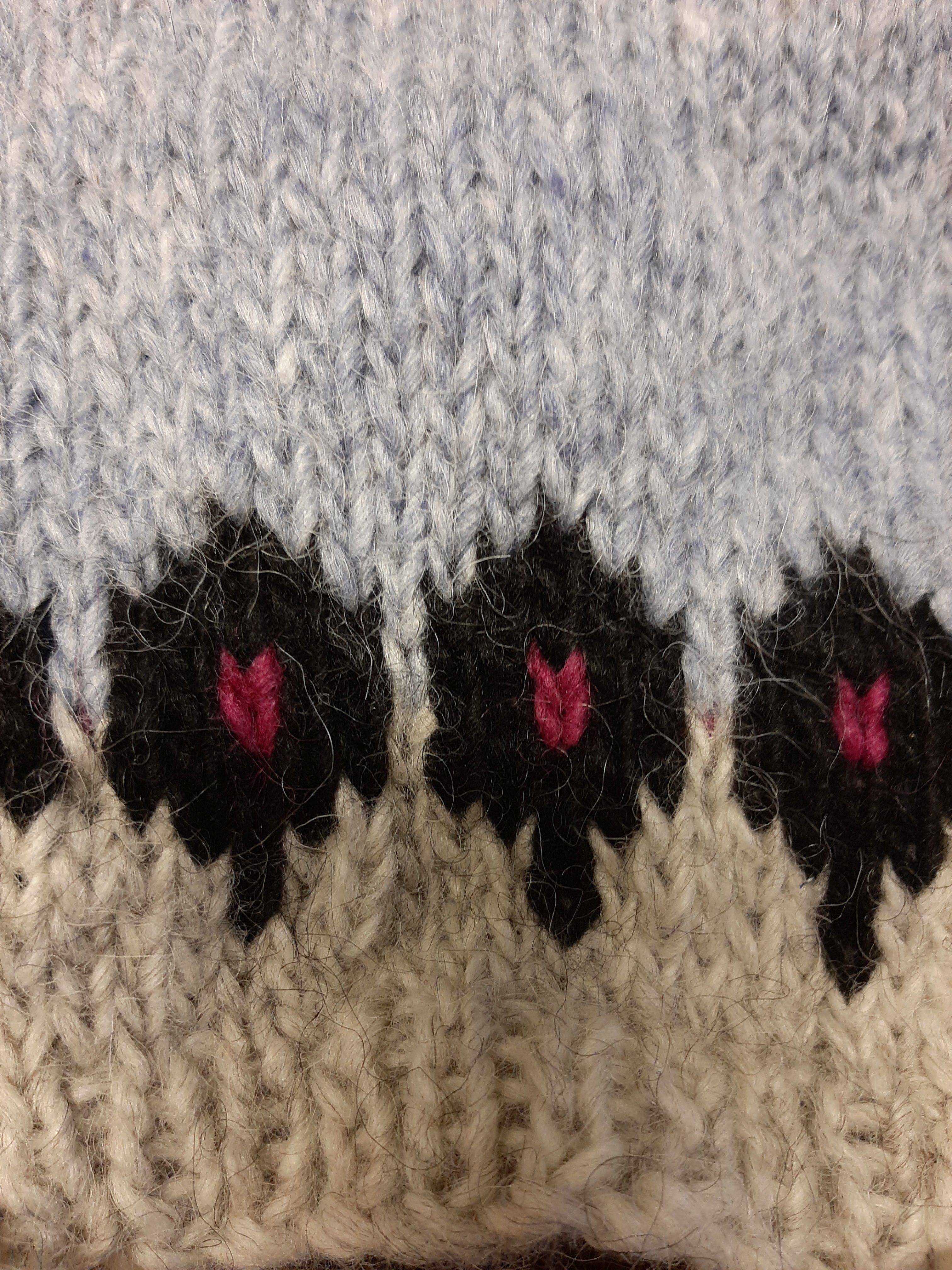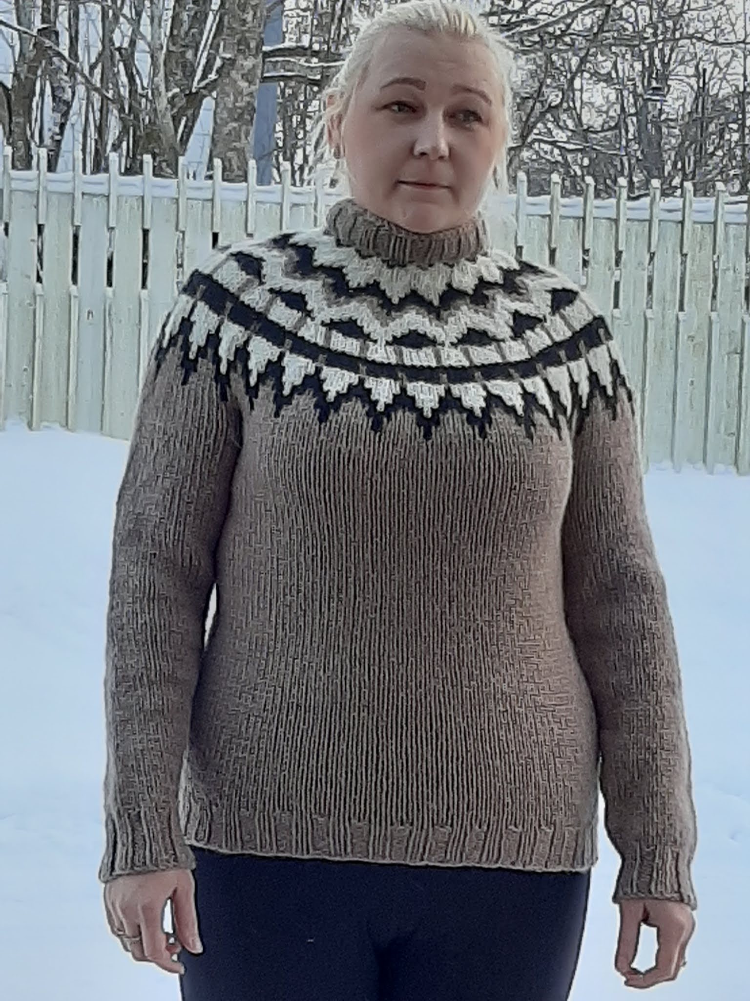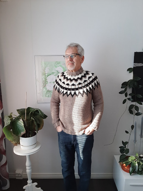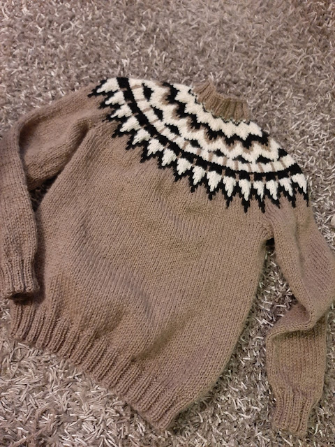 Islantilaisten neulepaitojen suosio on ollut uskomatonta. Minunkin puodissani se on näkynyt lankojen ja puikkojen jatkuvana virtana… Olen joutunut toteamaan asiakkailleni, etten itse osaa kirjoneuletta tehdä. Tämä tietysti kolauttaa itsetuntoon ja niinpä ”otin härkää sarvista” ja yritin. Tai oikeastaan siinä kävi hassusti: jo viime talvena aloitin islantilaset neuleet -kirjasta villatakin neulomisen, mutta rohkeus petti, kun olisi pitänyt kaarroketta ruveta tekemään. Olen siis esitellyt tätä puoliväliin tehtyä neuletta. Ja sellaisena se ehkä pysyykin tai ehkä puran…?