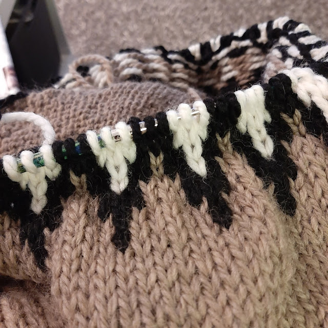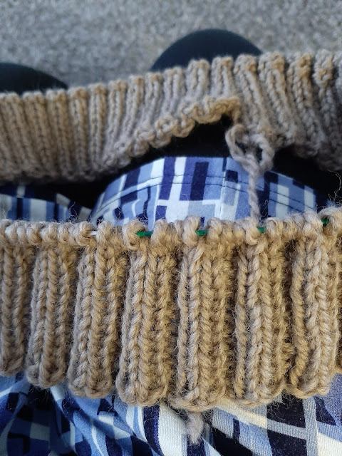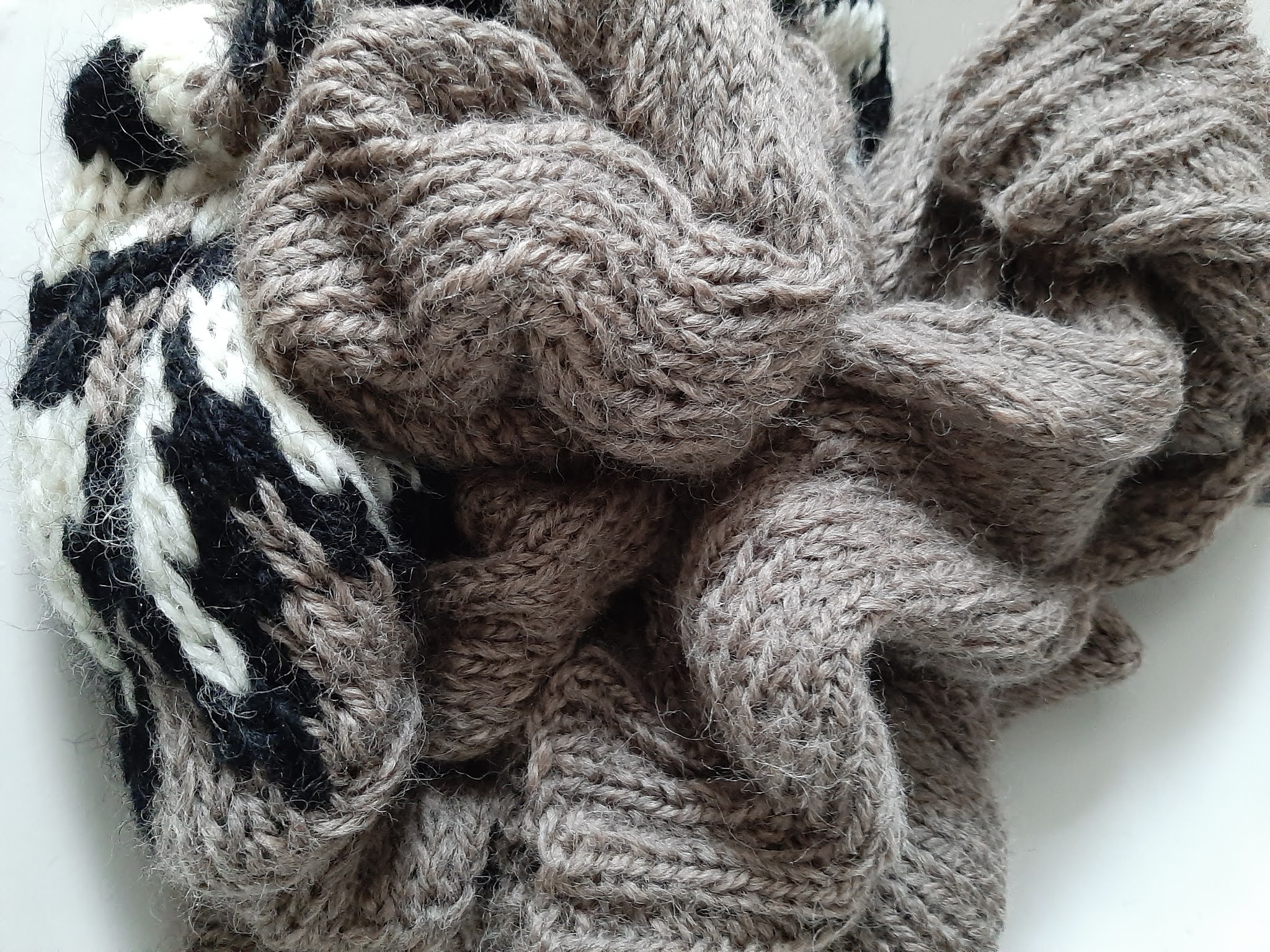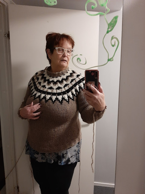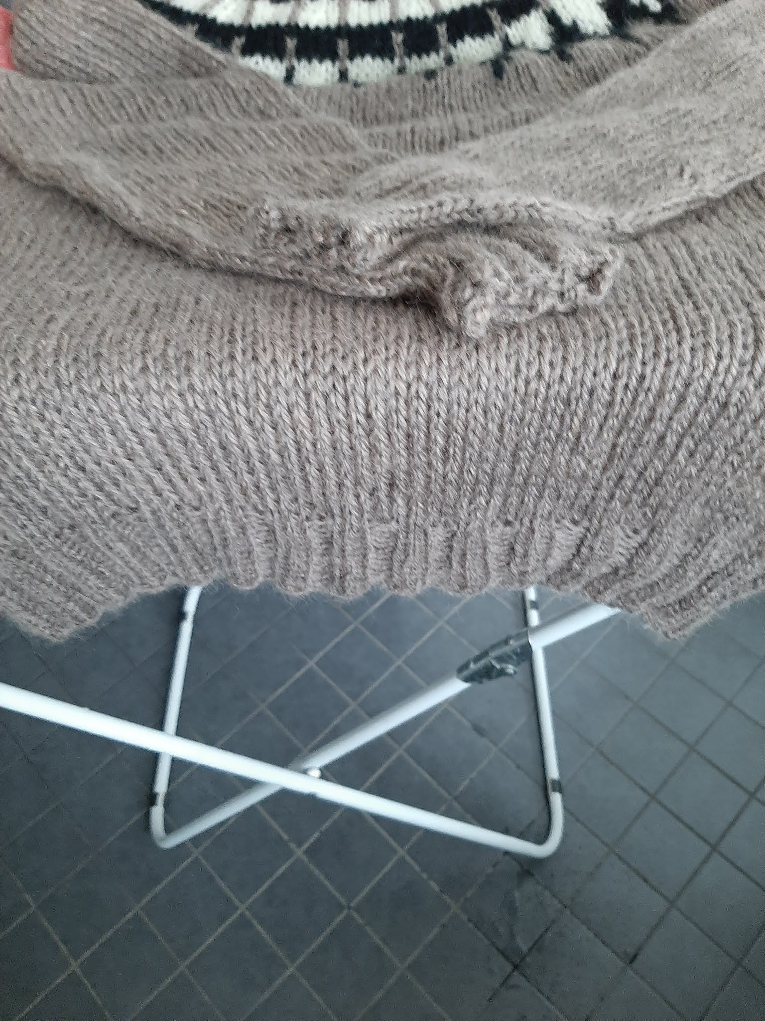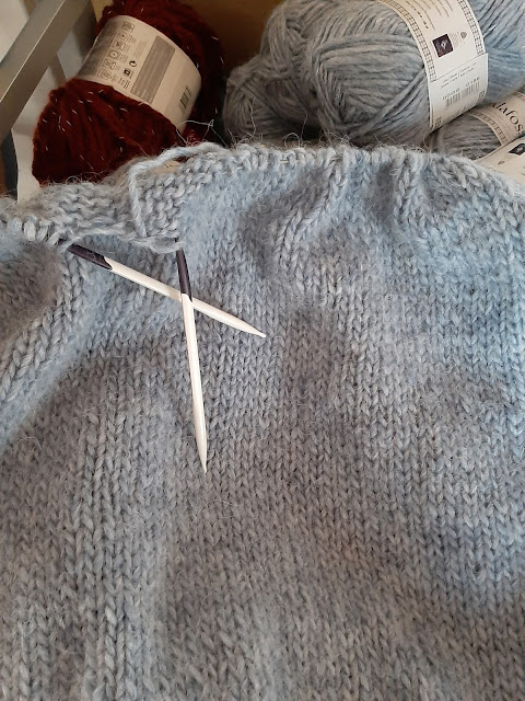Aloitin ennen vuodenvaihdetta ja pääsin kainaloihin asti, mutta taas loppui rohkeus. Työ roikkui sohvan pieluksella ja irvisteli mulle ilkeästi. Mutta päätin kuitenkin sitkeästi lukea ohjetta ja kieltämättä vähän tyylillä ”silmät kiinni ja antaa mennä” neuloin hyvin, hyvin löysää ja varsinkin lankajuoksut jätin löysiksi.