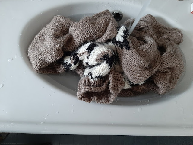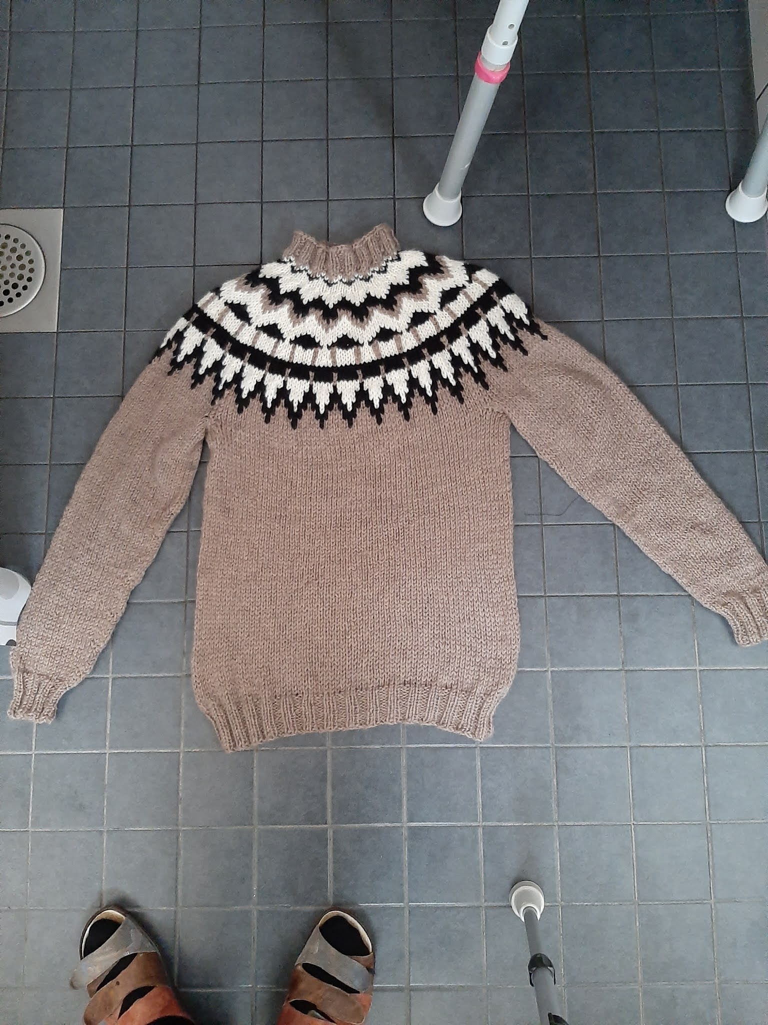 Aika lailla pelotti tämä kasteluvaihekin; entä jos paita kutistuu tai vastaavasti levistyy muodottomaksi? Hamittaa, etten ottanut mittoja ennen kastelua. Mutta arvelen, että olisko vähän mennyt kokoon?