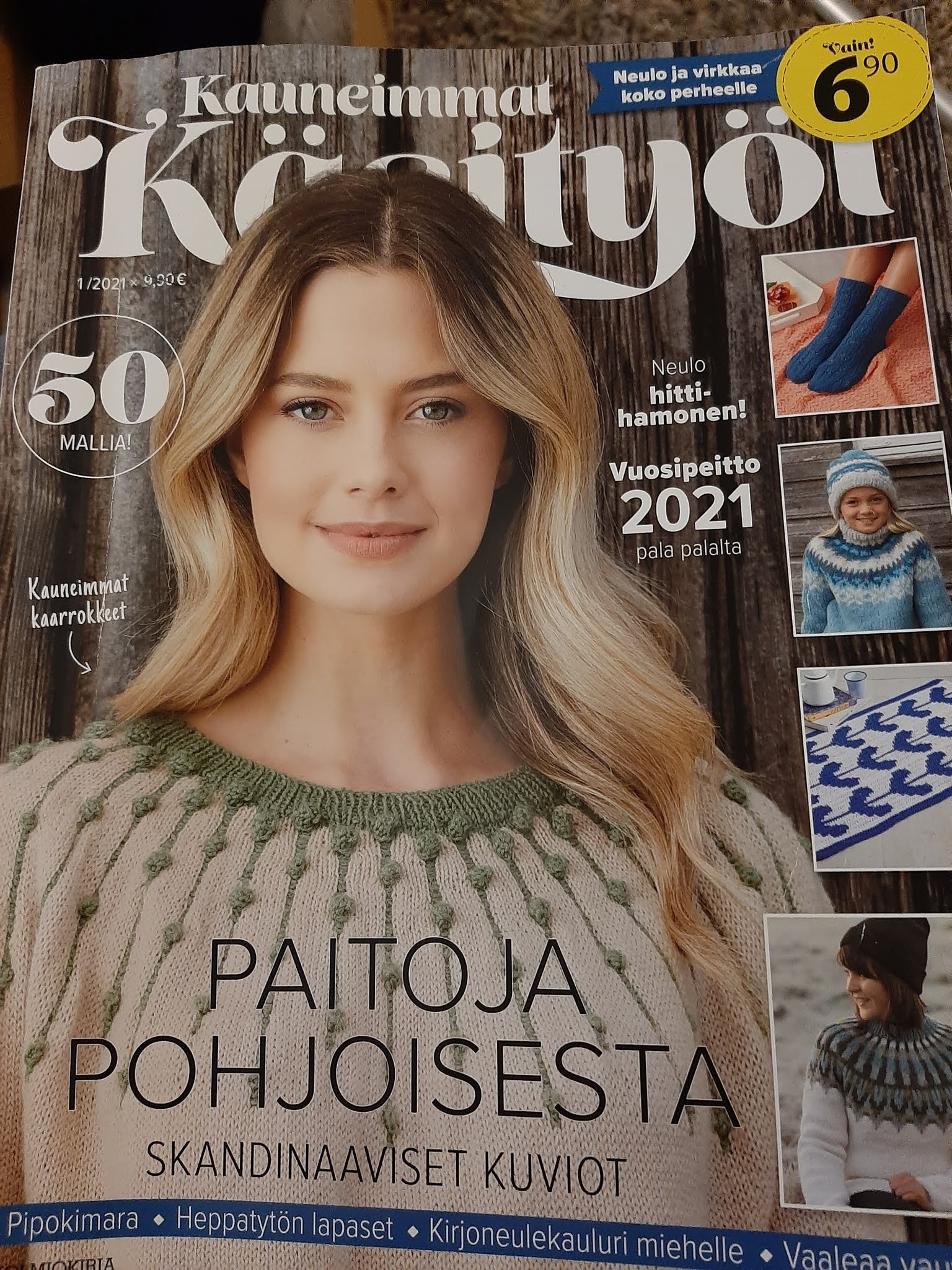 Harmitti oma uskalluksen puute ja tein, kuten usein teen: aloitin toisen puseron kuvitellen, että se olisi sitten jotenkin helpompaa. Valitsin ohjeen tammikuun Kauneimmat Käsityöt -lehdestä. Kyseessä on miesten paita, mutta sehän ei näissä kaarrokeneuleissa haittaa yhtään.