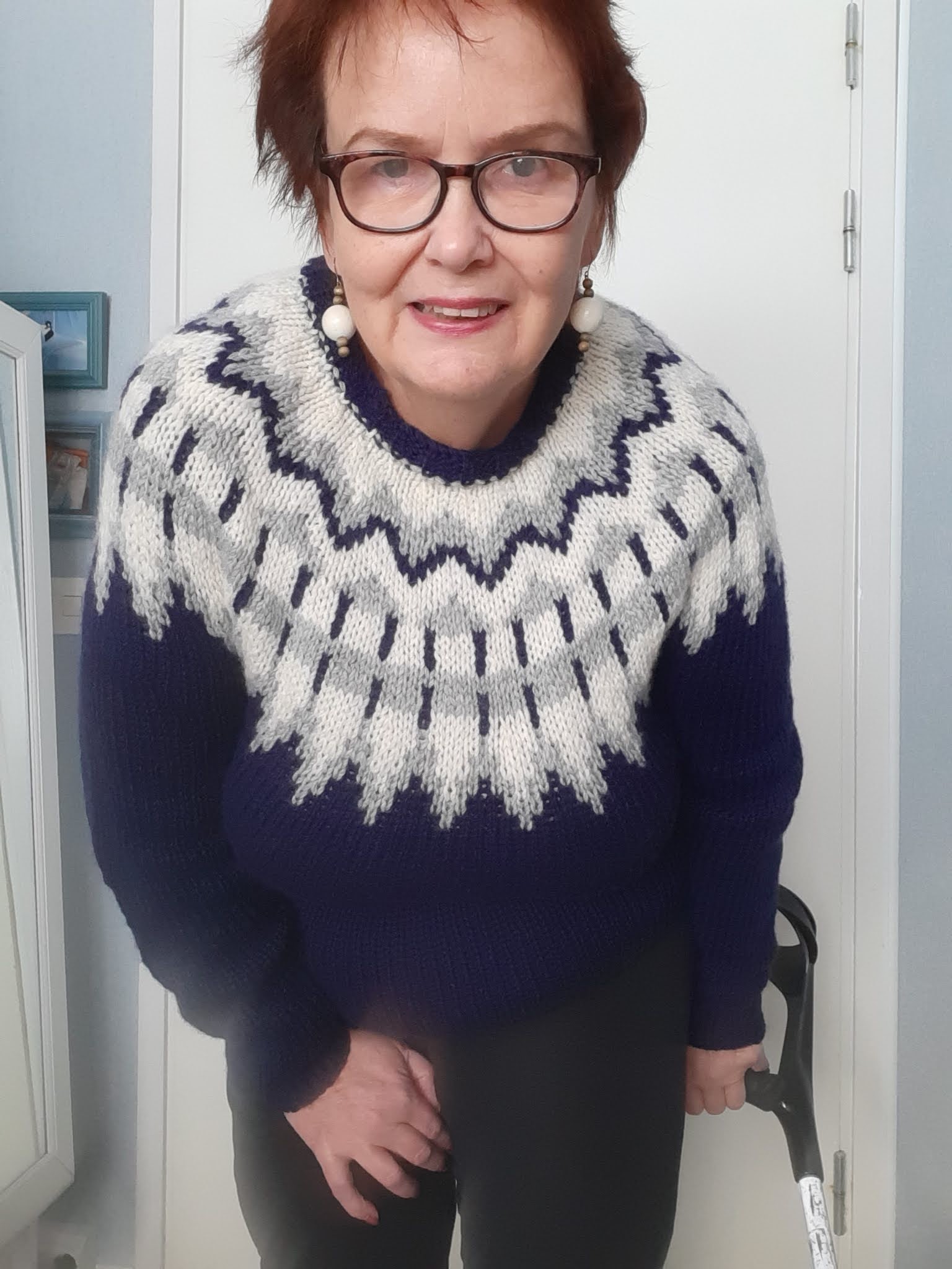 Minä tunsin amerikkalaista kateutta kaikkia niitä naisia kohtaan, jotka osaavat tehdä islantilaisen villapaidan ja tikuttavat niitä vieläpä koko suvulle. Myin kyllä lankoja ja puikkoja asiantuntevasti, mutta myönsin, etten itse osaa villapaitaa tehdä.