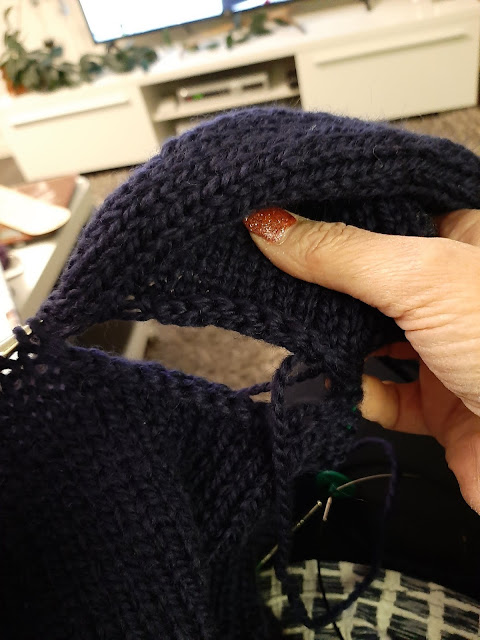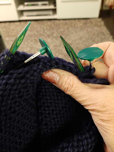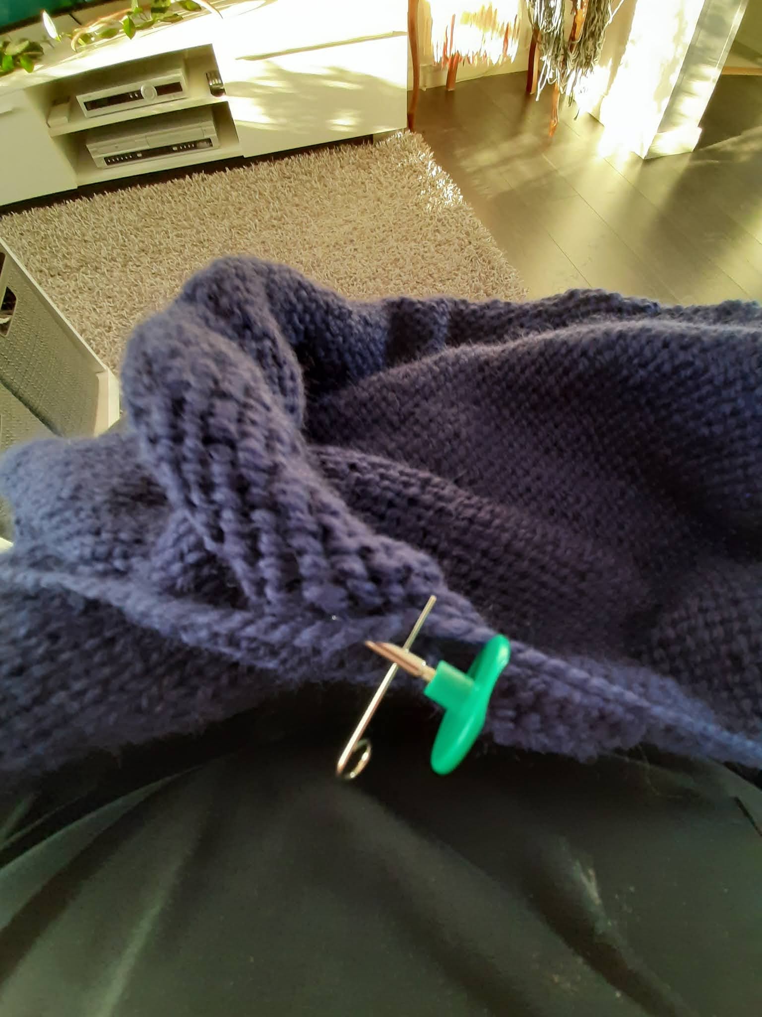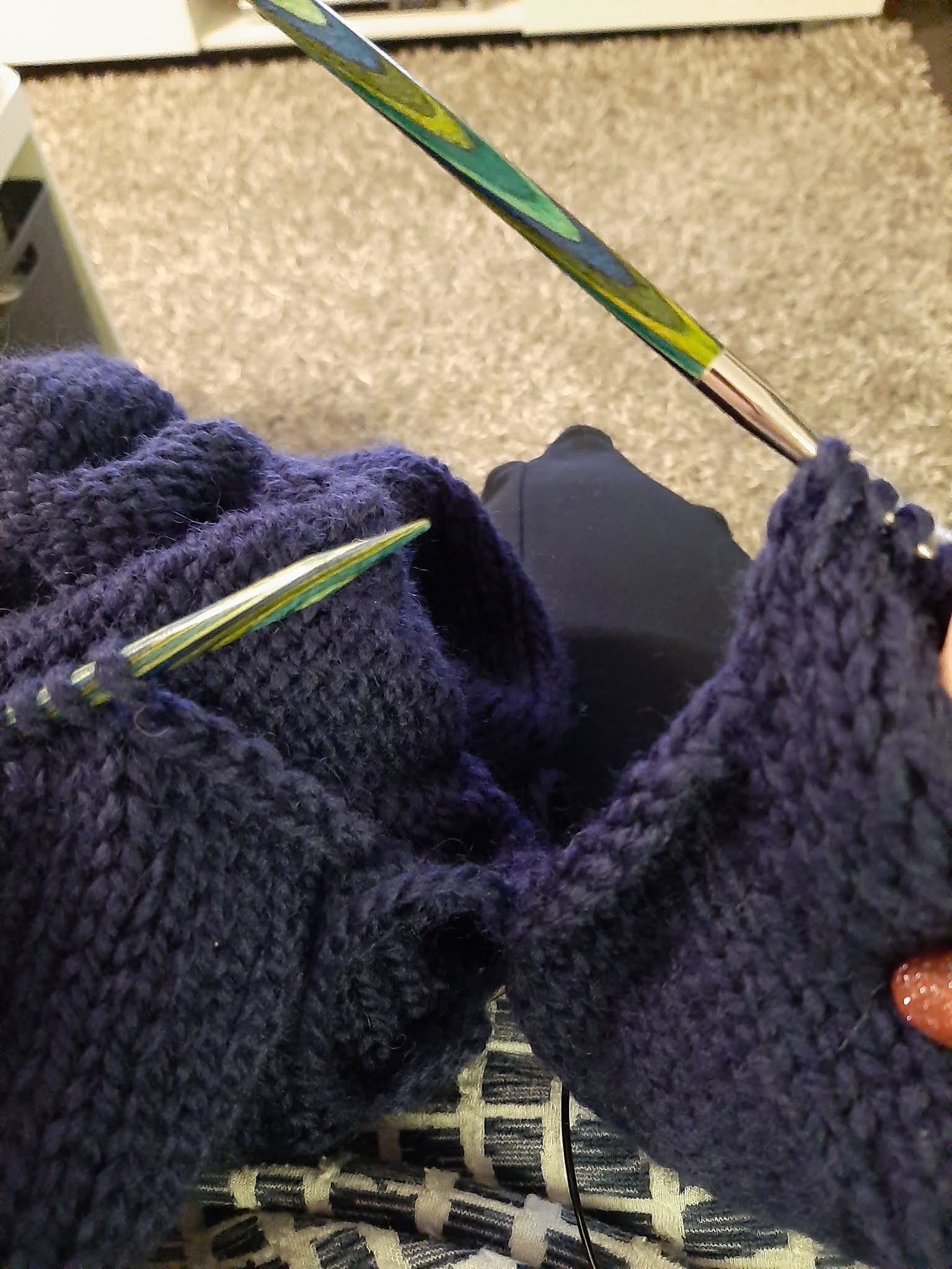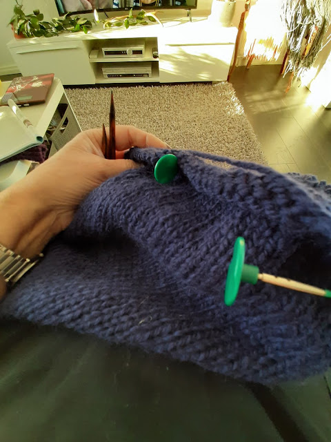 Miehustasta päätellään esim. 8 silmukkaa ja samoin hihan yläpäästä yhtä monta silmukkaa. Nämä päätelllyt silmukat laitetaan kohdakkain. Takana mun työssä miehusta on vihreillä puikoilla ja hiha edessä vihreitten tappien varassa.