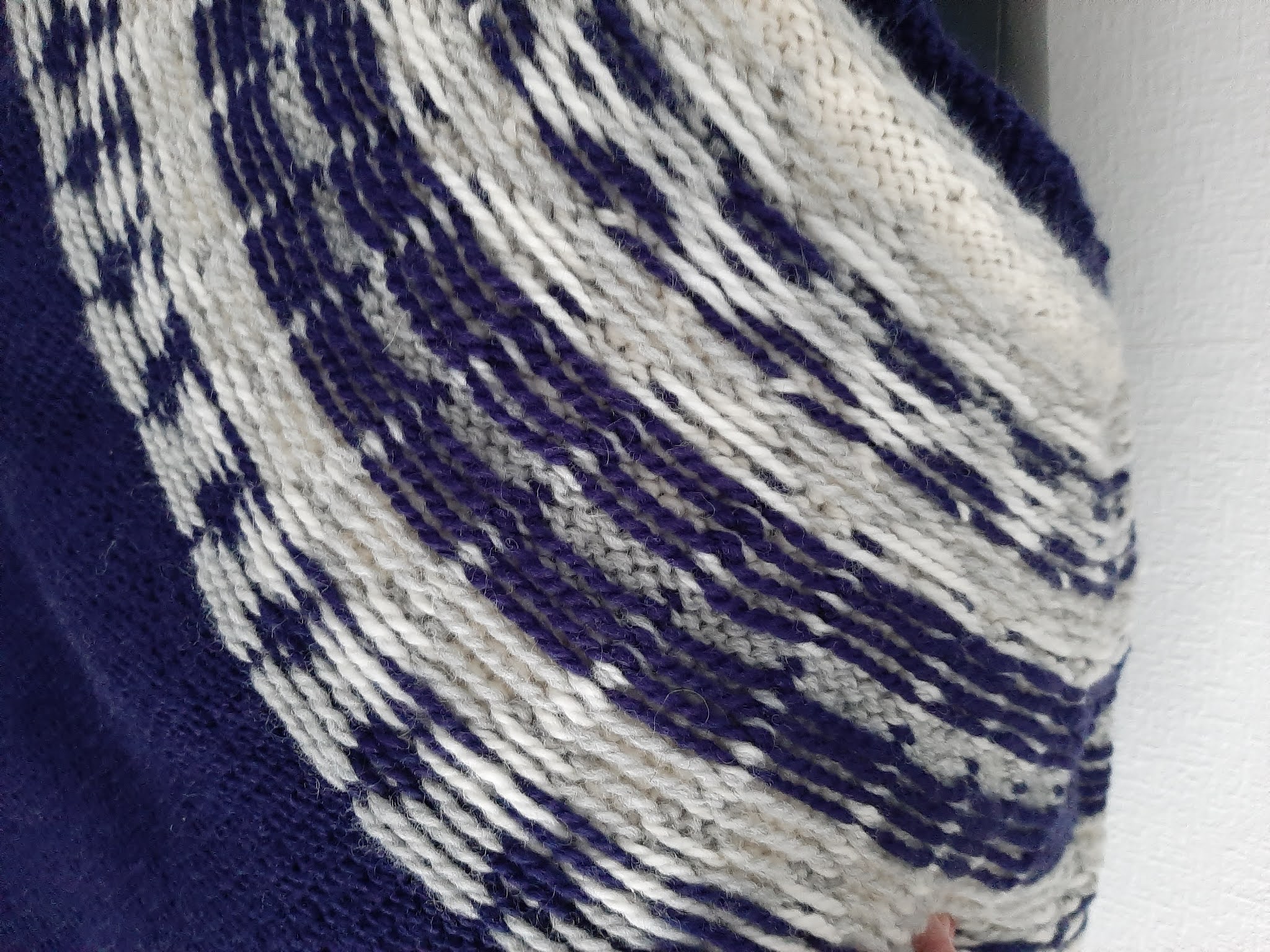 Olen ylpeä myös tästä nurjasta puolesta, kun lankajuoksut kulkevat nätisti järjestyksessään. Lankadominanssi toimii! Ja kaarroke ei kiristä yhtään, vaan olen onnistunut saamaan langat tarpeeksi – sopivasti – löysälle. Minun kikkani siihen on sormi langan ja työn välissä.