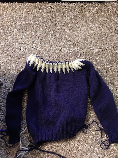 Sitten jatketaan kutomista miehusta (takakappale) – toinen hiha – miehusta (etukappale) – toinen hiha