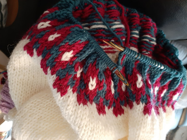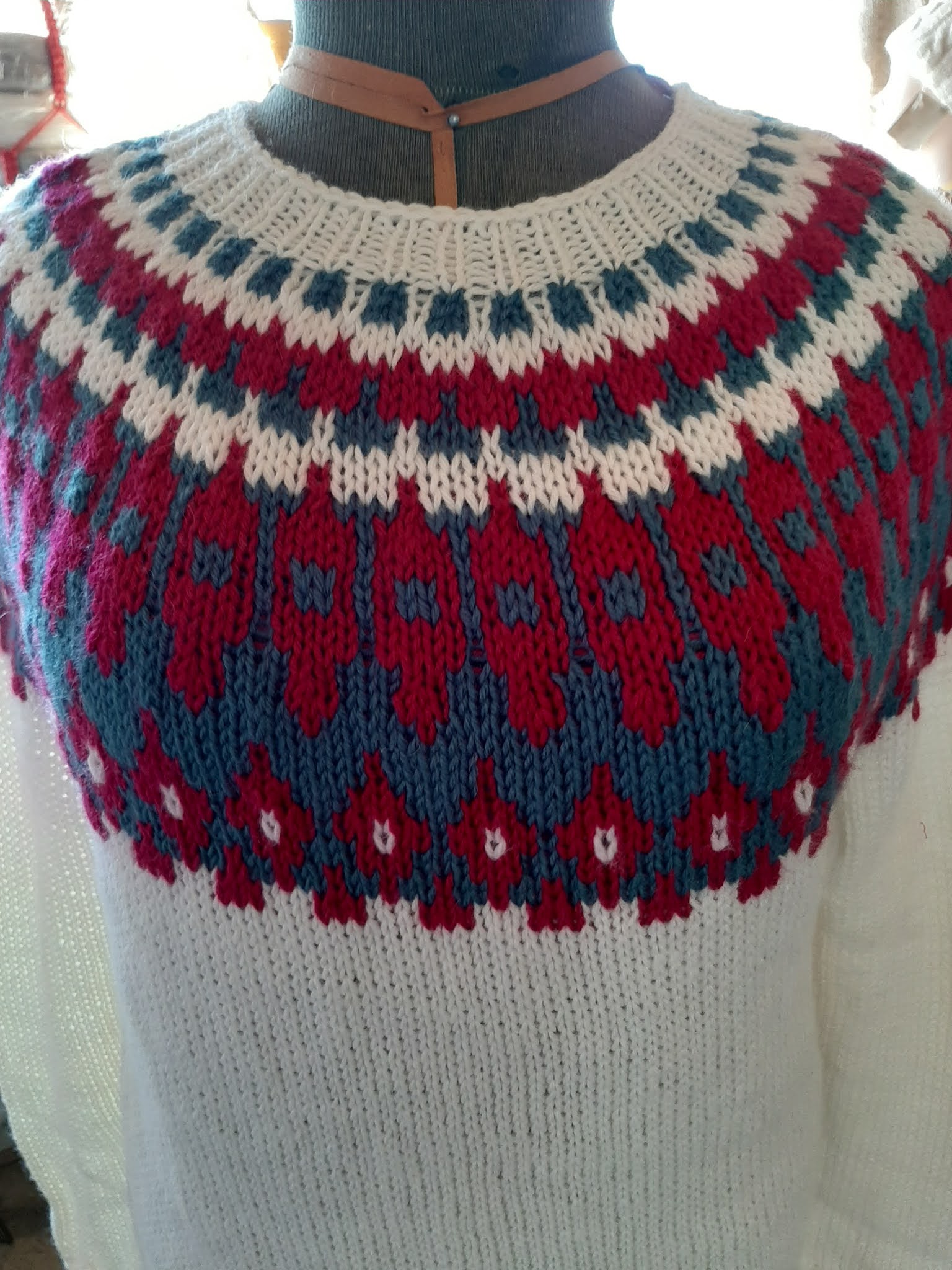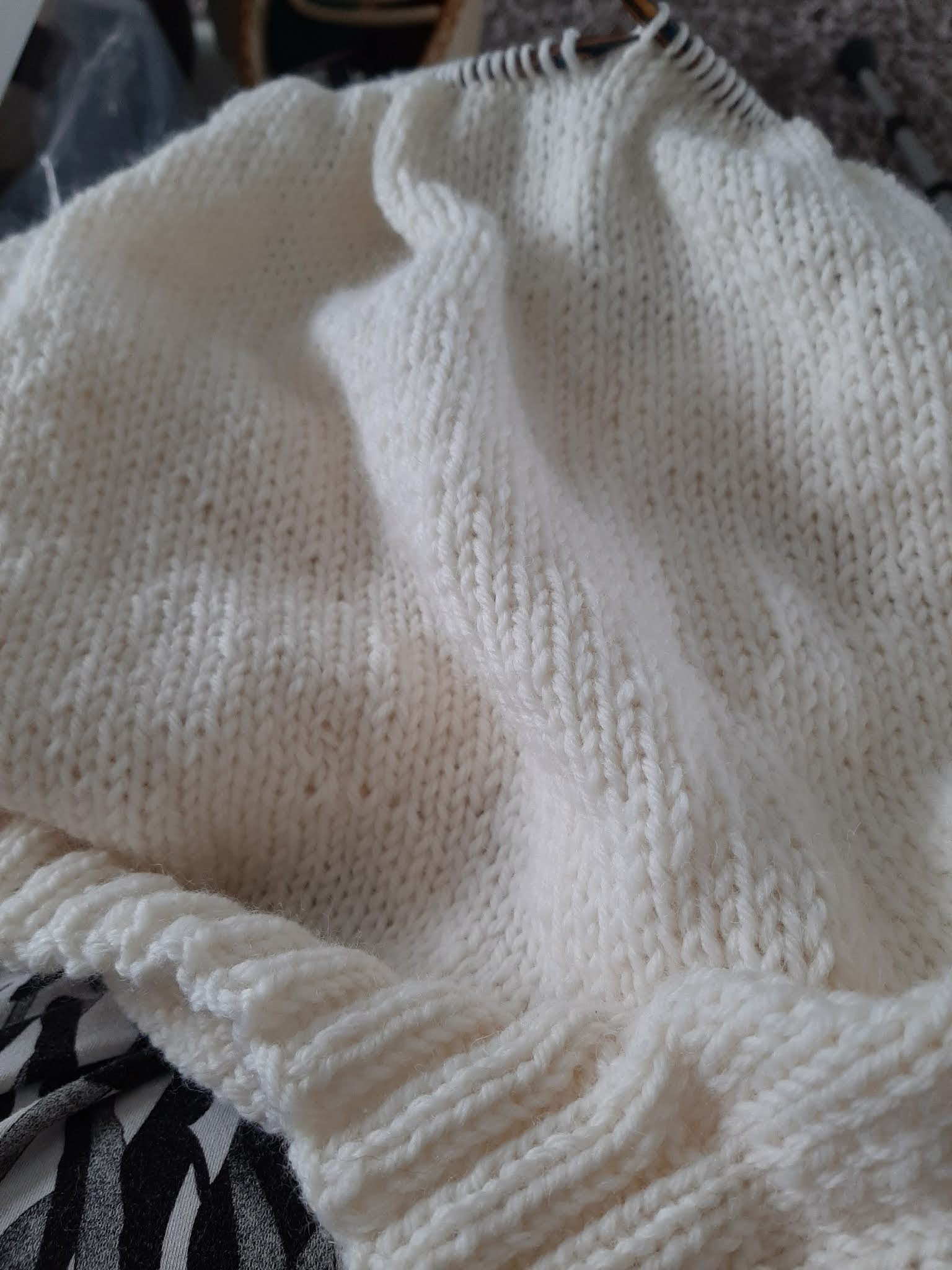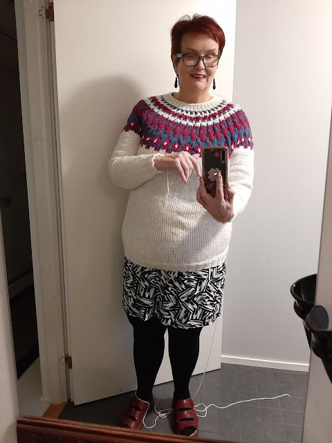 Tykkään mieluummin sellaisesta mallista, ettei hihoissa ja helmassa ole kirjoneuletta, joten alku on vähän tylsää. Kaarrokkeen kanssa on taas vähän liiankin jännittävää. Vaikka tekovaiheessa näyttääkin työ kupruilevalta, olen jo oppinut luottamaan, että kyllä työn jälki tasoittuu. Mun on päästävä aina heti sovittamaan ja yllätys, yllätys, kaikki tekemäni puserot ovat näyttäneet ihan puserolta!