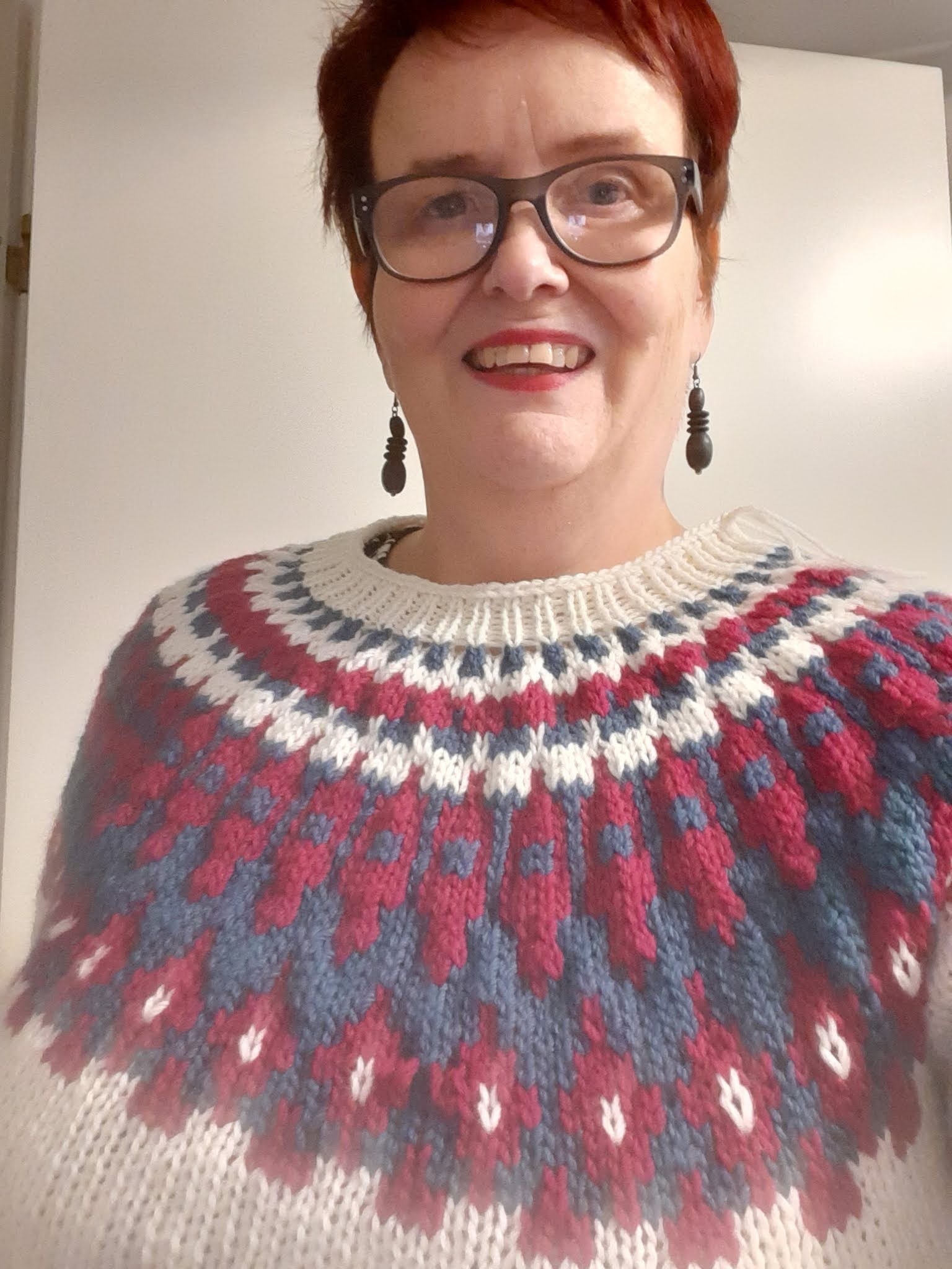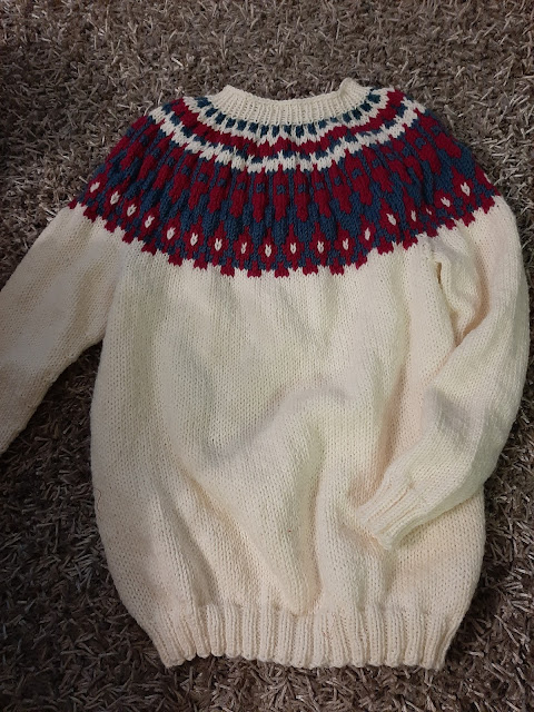 Mä en voi hillitä itseäni. Tämän viimeisimmän puseon kanssa olin vähän epävarma, kun otin käyttöön eri ohjeen. Tämä malli on Islantilaisia neuleita -kirjasta, mutta se on tehty Alafosslopille, joka on paksu lanka. Mallin nimi on Stapi eli kallio. Ohje on vetoketjulliselle takille. Vasta kaaroketta aloittaessani tajusin, että jos tekee ohuemmalla langalla kuin mitä ohjeessa on, ei riitä, että tarkistaa silmukkamäärät sopivaksi, myös kerrokset on ajateltava uusiksi. Ei paksun langan kerrokset riitä ohuemmalle langalle. Nyt siis ensimmäisen kerran sävelsin väliin omia kerroksia. Mittasin aiemmista paidoista, että kaarroke tulisi tarpeeksi pitkäksi, mutta silti jäi ilmaan leijumaan epävarmuus. Mutta ihan nappiin osui!