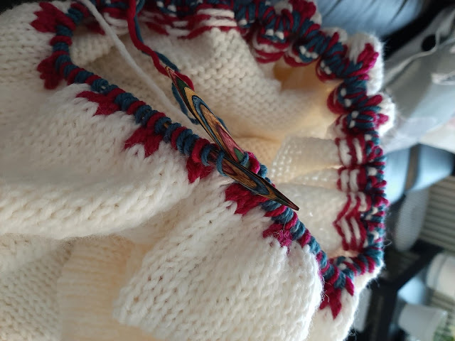 Tässä työssä vaihdoin puikkoja moneen kertaan, ennen kuin löysin sopivat. Loppujen lopuksi neuloin 6,5 mm pyöröpuikoilla, jotka olivat vain 60 cm pitkät. En halua käyttää liian pitkiä puikkoja, vaan pidän siitä, että työ on ”rutussa”, jolloin sitä ei tarvitse koko ajan kiskoa lähemmäs. Tein siis myös kaarrokkeen 60 senttisellä, pääntiellä vaihdoin sukkapuikkoihin.