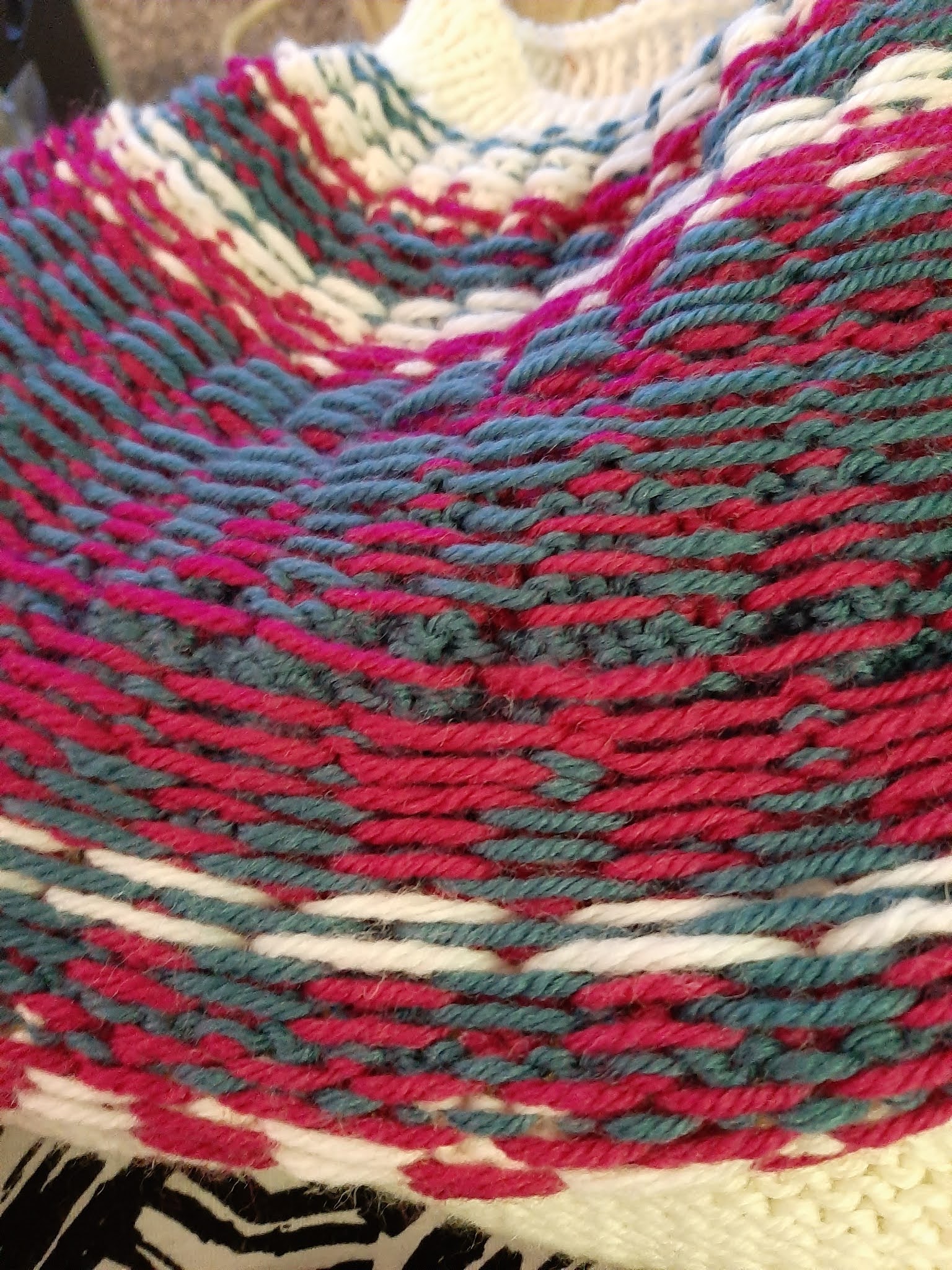 Minä halusin koittaa meille uutena tullutta Himalaya Efsun -lankaa, joka on 100 % villaa ja hinnaltaan tosi edullinen. Lankaa tähän kului vähän reilu 500 g, mutta puoli kiloa riittää hyvin. Hinnaksi tälle tuli siis vain 25 euroa! Tai noh, melkein… raitoja varten on ostettava 100g kerä, mutta se ei kokonaan tule käyttöön… Ja tuntuma on pehmeä, lähes puuvillalta tuntuva. Tykkään kovasti.