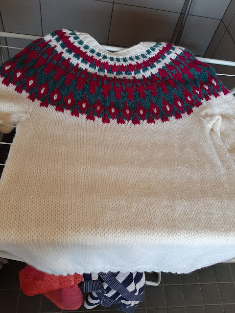 Vielä en ole uskaltanut yhtään puseroa laittaa pesukoneeseen, vaan kastelen kokonaan pesualtaassa. Laitan kuivumaan tasona ja miten silmiä hivelevää onkaan seurata, kuinka työ tasoittuu, rakastan sitä ensi silmäystä!