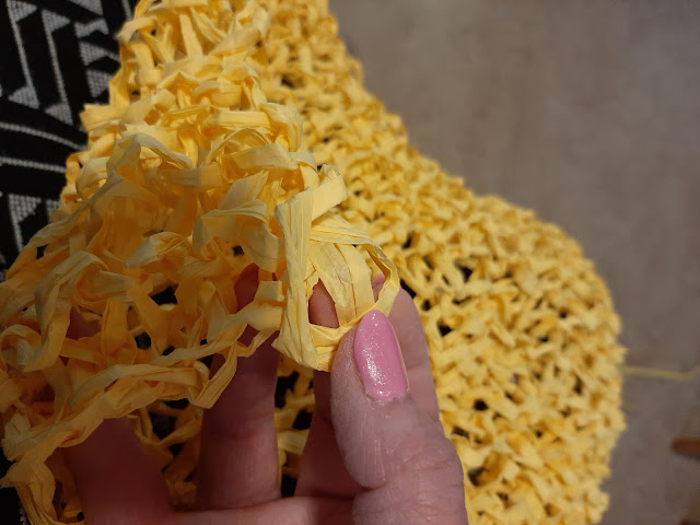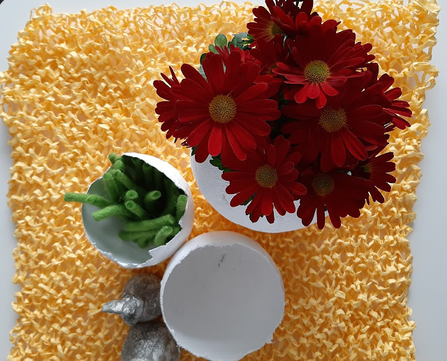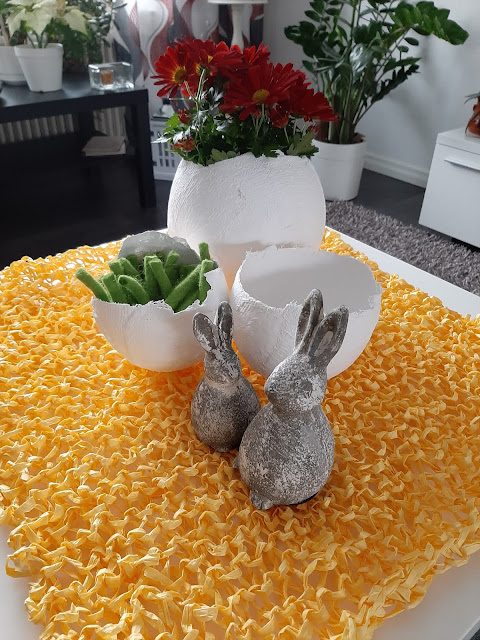 Aikoinaan kun näitä teimme, mankeloimme työn ihan littanaksi. Nytkin sitä mietin, tai en mankeloimista, kun en omista mankelia, mutta silittämistä. Muistelen, että silittäminen ei litistä yhtä tehokkaasti ja nyt päätinkin jättää työn ihan sillensä. Tällaisena pääsiäisasetelman alustana se sopii oikein hyvin olemaan tuollainen pöyheä.