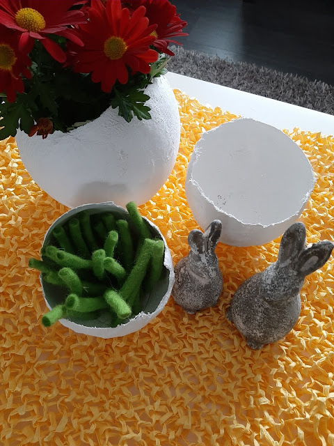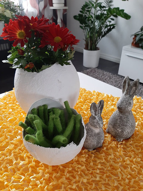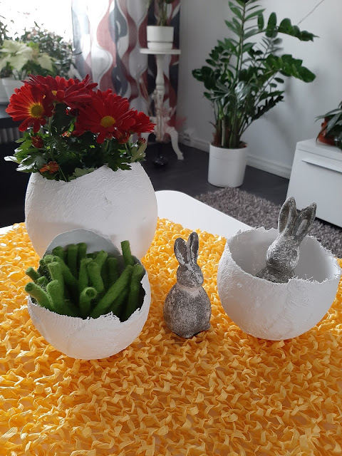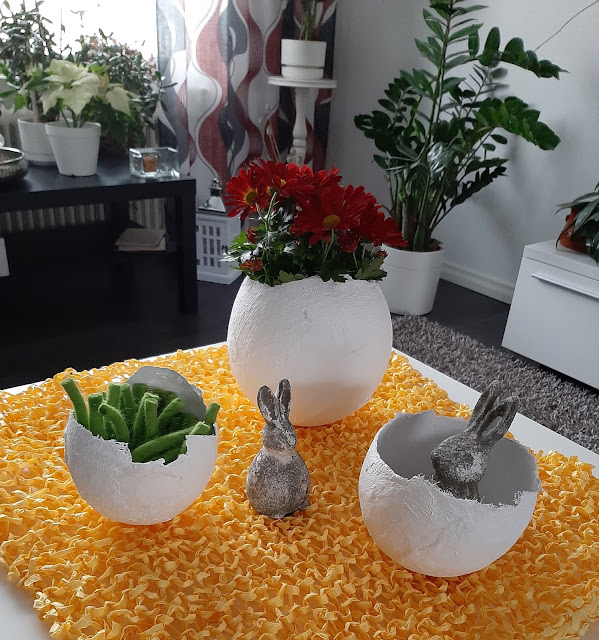 Voi, miten kivoja kuvia sainkaan, kun sattui vielä aurinkokin paistamaan. Nuo puput on ostettu aikoinaan ukilaisesta sisustusliikkeestä Ulpukasta. Isot munankuoret olen itse askarrellut silloisen avustajani kanssa jo muutama vuosi sitten.