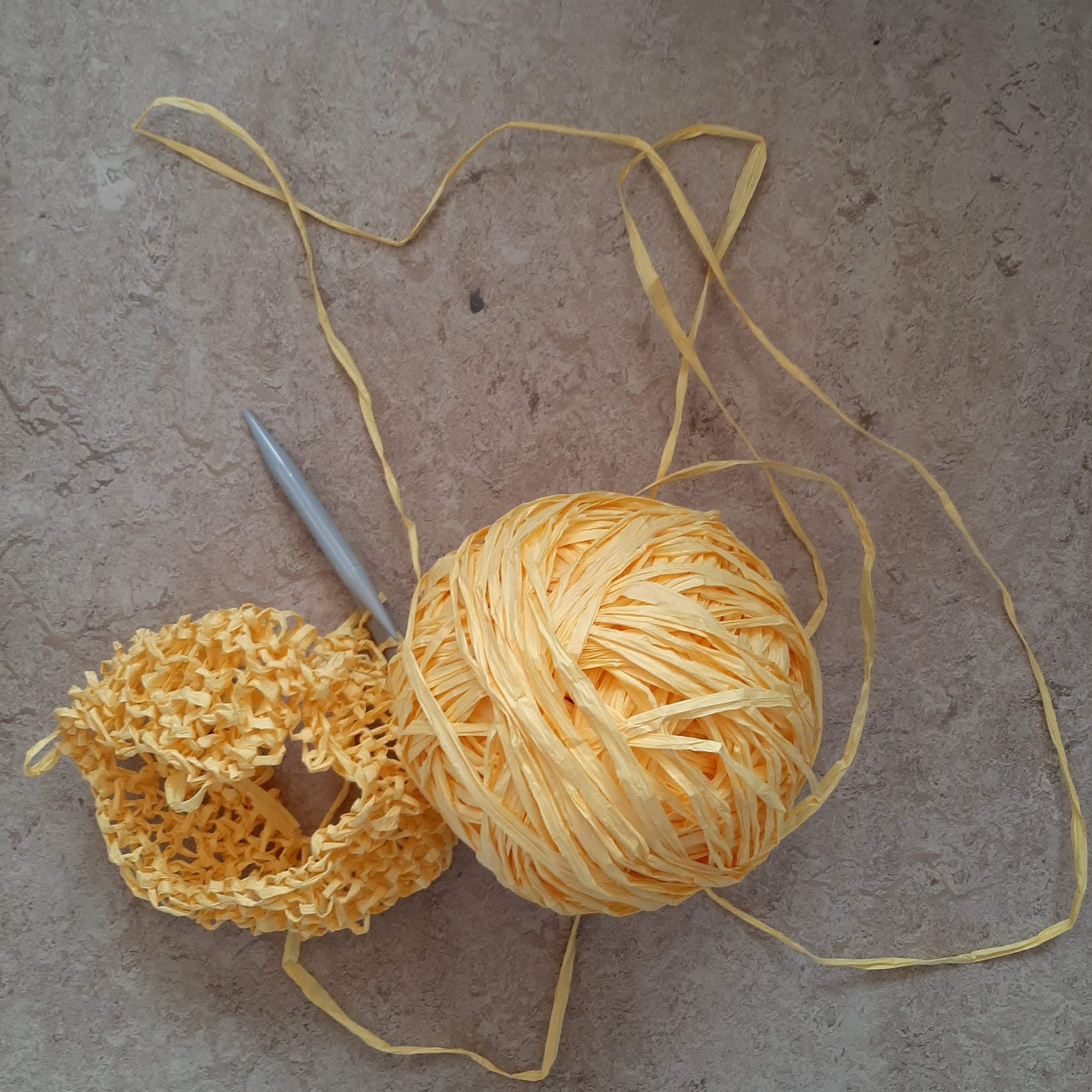Tarvitset paperinarua ja paksut pyöröpuikot. Vähintään 10 mm, minulla oli tässä työssä peräti 15 mm. Ja työ on helppo, neulot mahdollisimman epätasaista ja aina oikeaa. Ei kannata edes yrittää tehdä tasaista, koska lopputulos on sitä kauniimpi, mitä vähemmän siinä erottuvat silmukat ja kerrokset. Tähän työhön loin 50 silmukkaa.