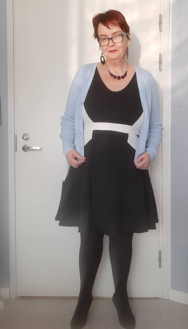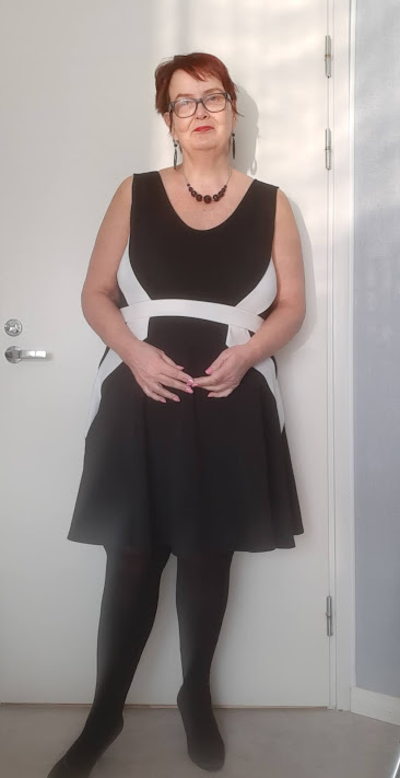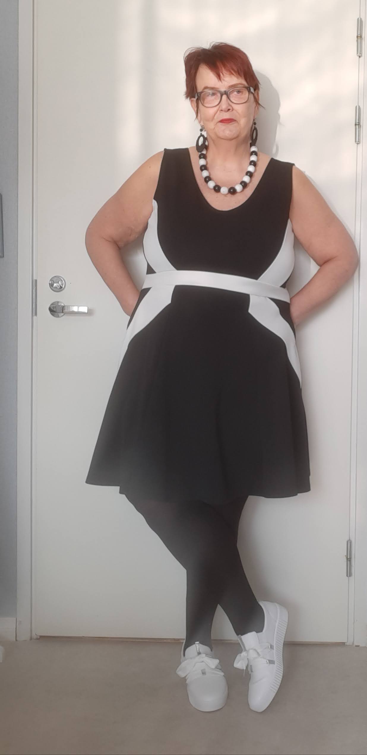 En tiedä, miltä ajalta tämä mekko on – koska ja mistä se on ostettu – mutta minun mieleeni se tuo 60-luvun.  Asustin sen myös isoilla mustavalkoisilla helmillä ja toisaalta myös valkoisilla rusettitennareilla.