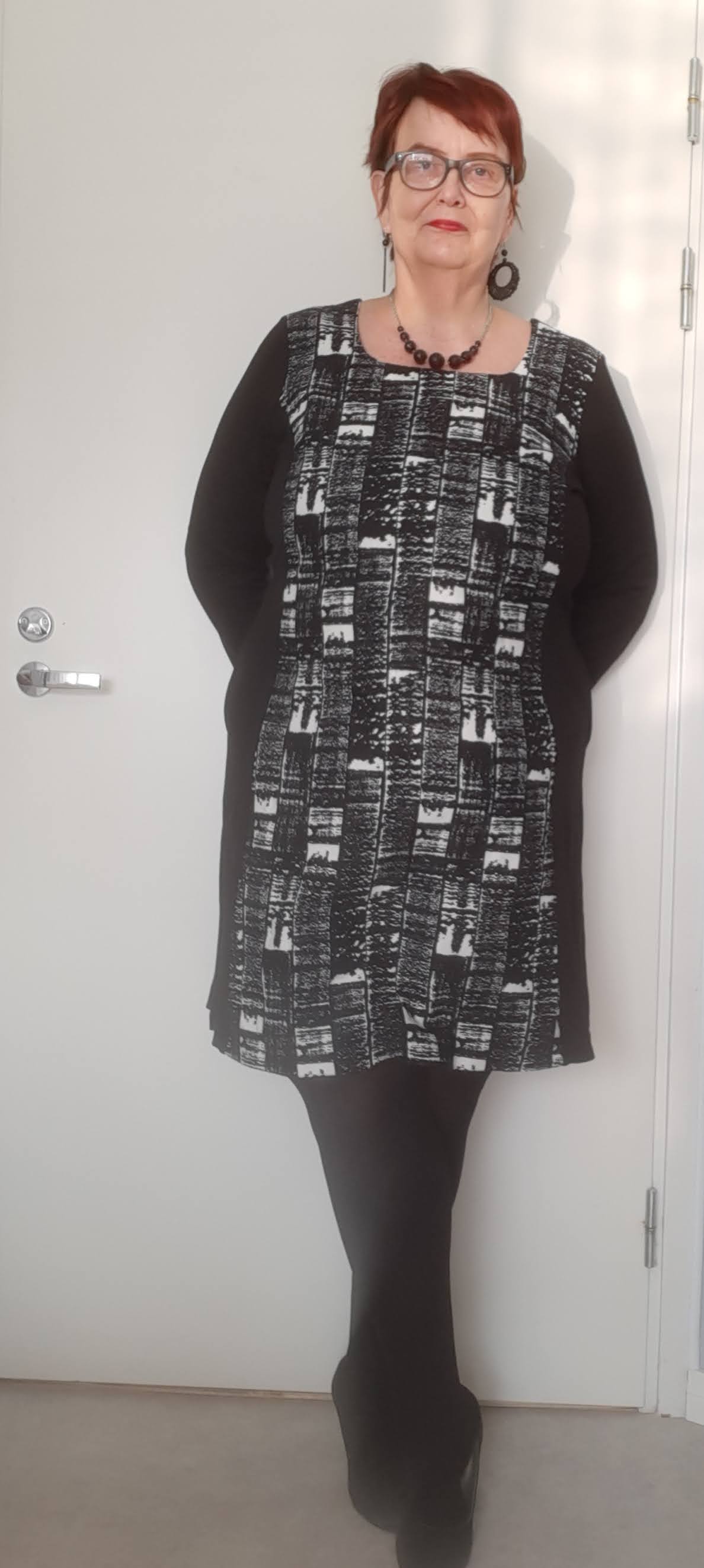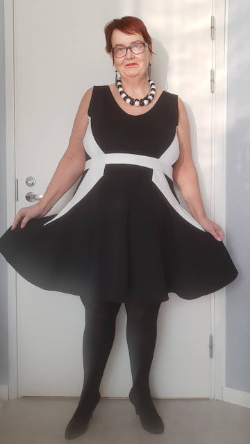 Kyllä se on totta – suurin osa vaatteistani on mustavalkoisia. Kokonaan mustia on kuitenkin vain muutama. Tämän ihastuttavan mekon olen ostanut toissakesänä maaseutukirpparilta. Jos olisin päässyt sovittamaan sitä ostohetkellä, olisi se ehkä jäänyt rekkiin. Vaikka joustavaa materiaalia onkin, silloin mekko oli auttamatta liian pieni. Mutta onneksi olen säästänyt sen tavoitemekkona ja nyt se mahtuu hyvin ja tykkään ihan hirmuisesti. Enpä muista, milloin olisin kellohelmaista hamosta käyttänyt viimeksi, joskus tyttösenä ehkä?