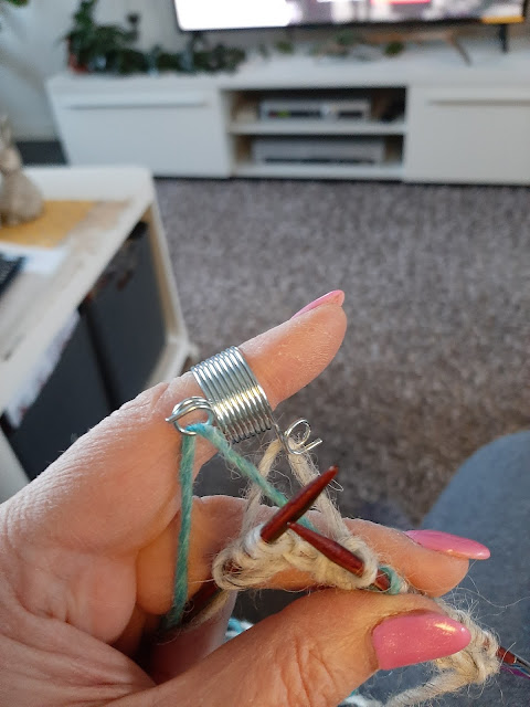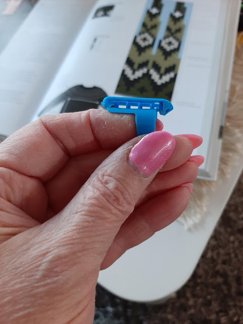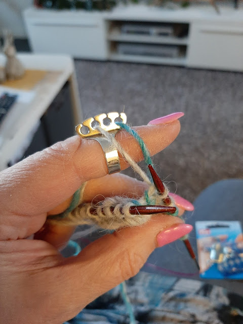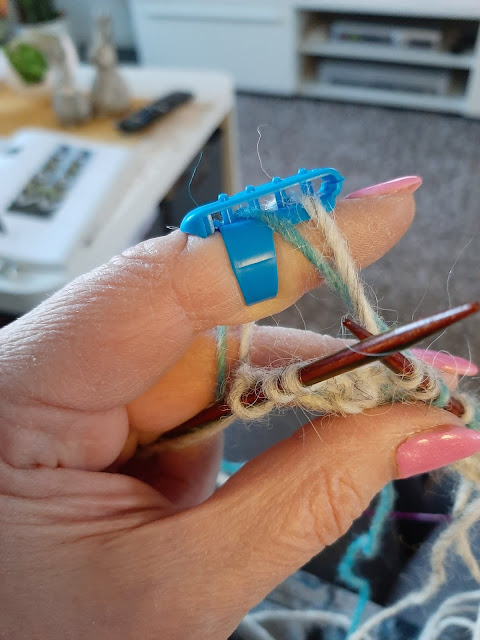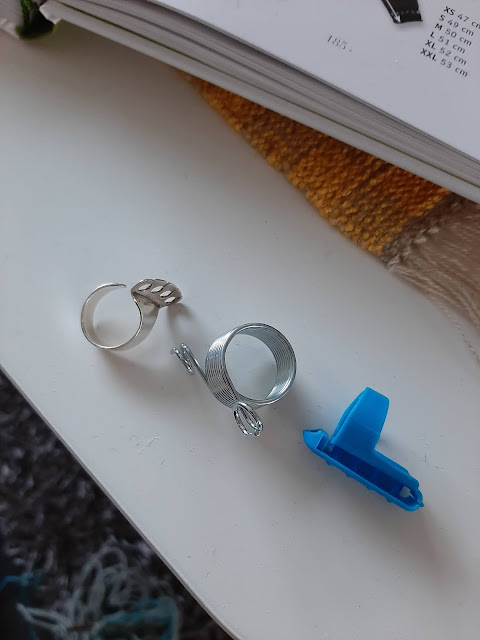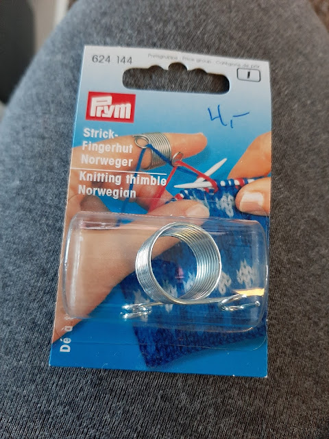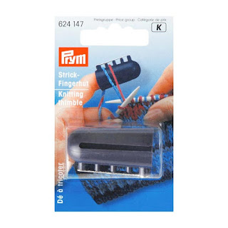 Taannoin meillä oli vielä huonompaa, enkä sitä ole enää pitänytkään myynnissä. Se oli tällainen Prymin kovamuovinen ”neulesormustin”, joka ei ainakaan minun sormessani pysynyt laisinkaan.