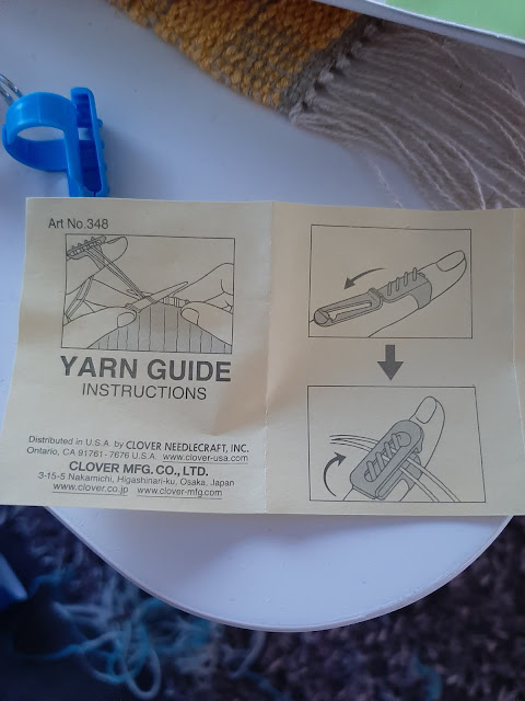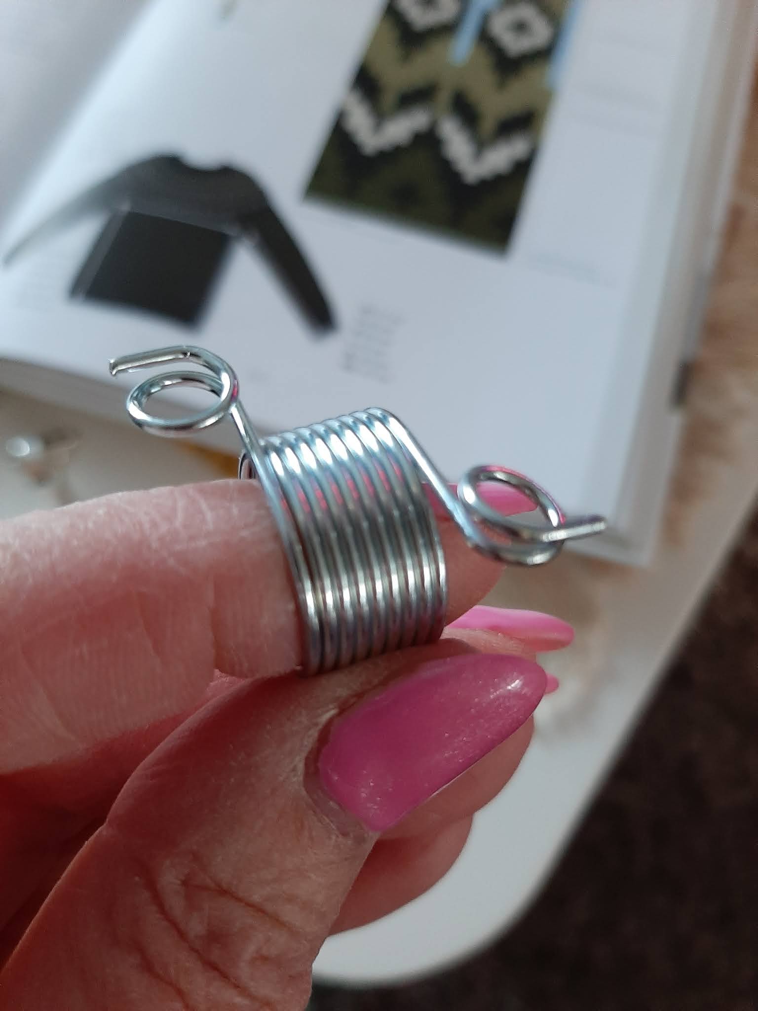 En päässyt sinuiksi tämän rautahärvelin kanssa ja siksi epäillen sitä asiakkaallekkin näytin. Minun ongelmani on se, että olen tottunut kuljettamaan langat etusormen YLI ja ainakin kuvan mukaan ne tätä käytettäessä pitäisi kulkea … noh, tuollain, mitä kuva näyttää… Enkä saanut spiraalia pysymään sormessani, vaikka sitä yritin säätää sopivaksi.