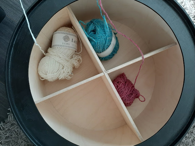 Näin pysyvät ainakin neljä lankakerää omilla paikoillaan. Totta puhuakseni, olen vain tätä kuvaa varten laittanut langat näin. Normisti tämä on pullollaan keskeneräisiä neulomuksia ja työssä kiinni olevat kerät valtoimenaan….missä mikin.