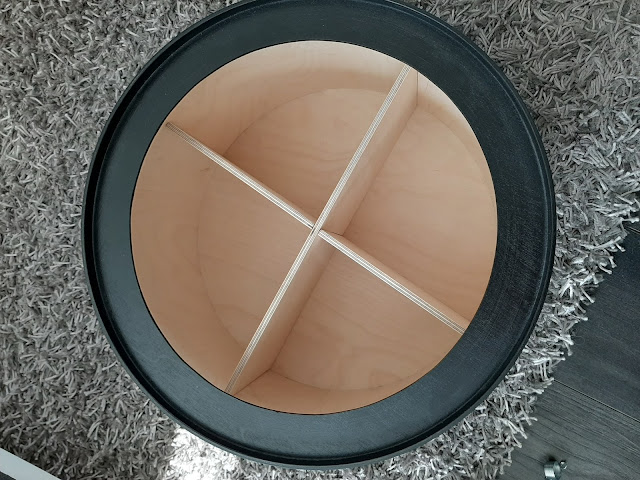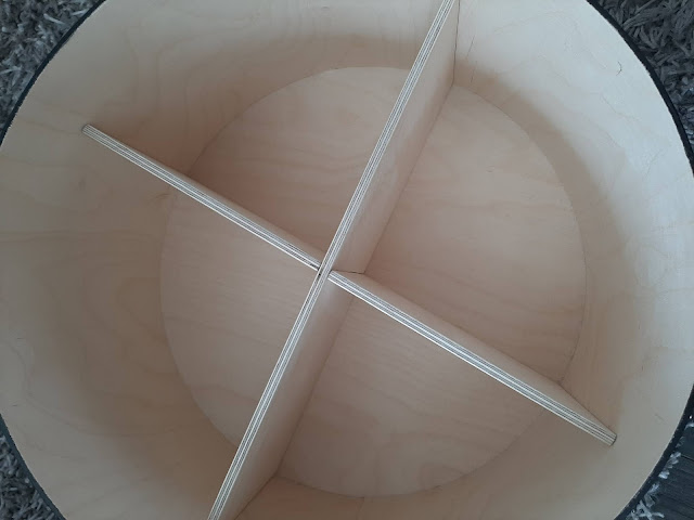 Tämä taisi olla kaikkein suurin kotimaisen valmistajan lankasäilö, jota sittemmin olen nähnyt jopa kansalaisopiston kursseilla matkittavan. Mutta puretaanpa osiin tämä lankajärjestelijä: pohjasta selviää, että kyseessä on aito vanerikko. Siinä on monta irtoavaa osaa: