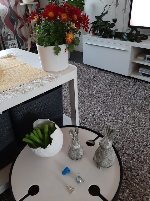 Ja sitten vielä pieni episodi tämän postauksen tekemisestä. Tuo hopeasormus oli kadoksissa. En tiennyt, onko se kotona vai myymälän puolella. Aamupäivän aikana tuli siivottua kotona neulenurkkaukseni perinjuurin ja kaupassa jopa kassapöytäkin, kun tuota etsin. Yritin mennä polvillenikin, jotta olisin tarkistanut sohvan ja nojatuolien aluset, mutta ei, siitä ei tullut mitään.