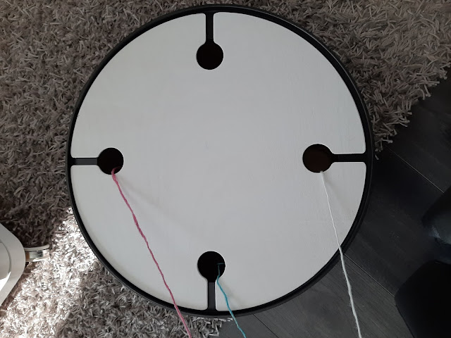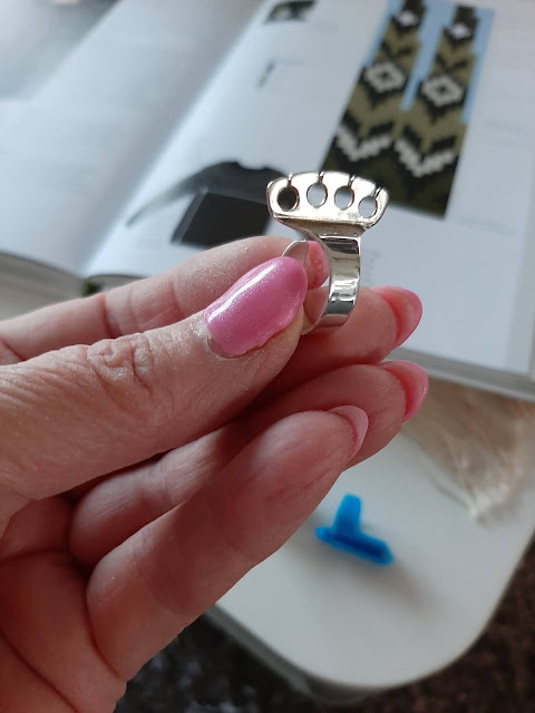 Sitten löysin toimivan vehkeen! Tämä pysyy sormessa, siihen saa neljä lankaa.
