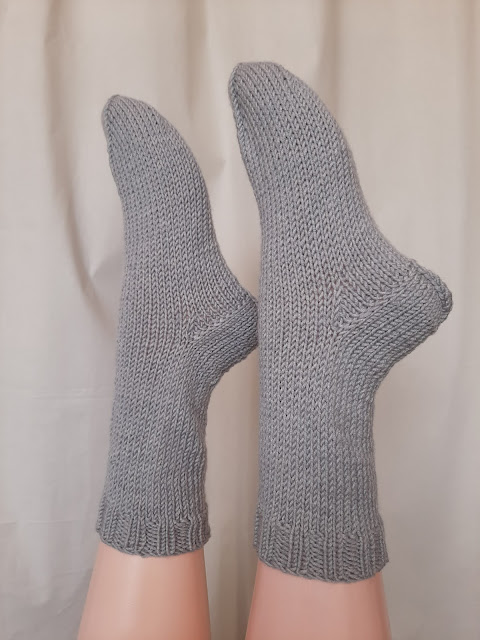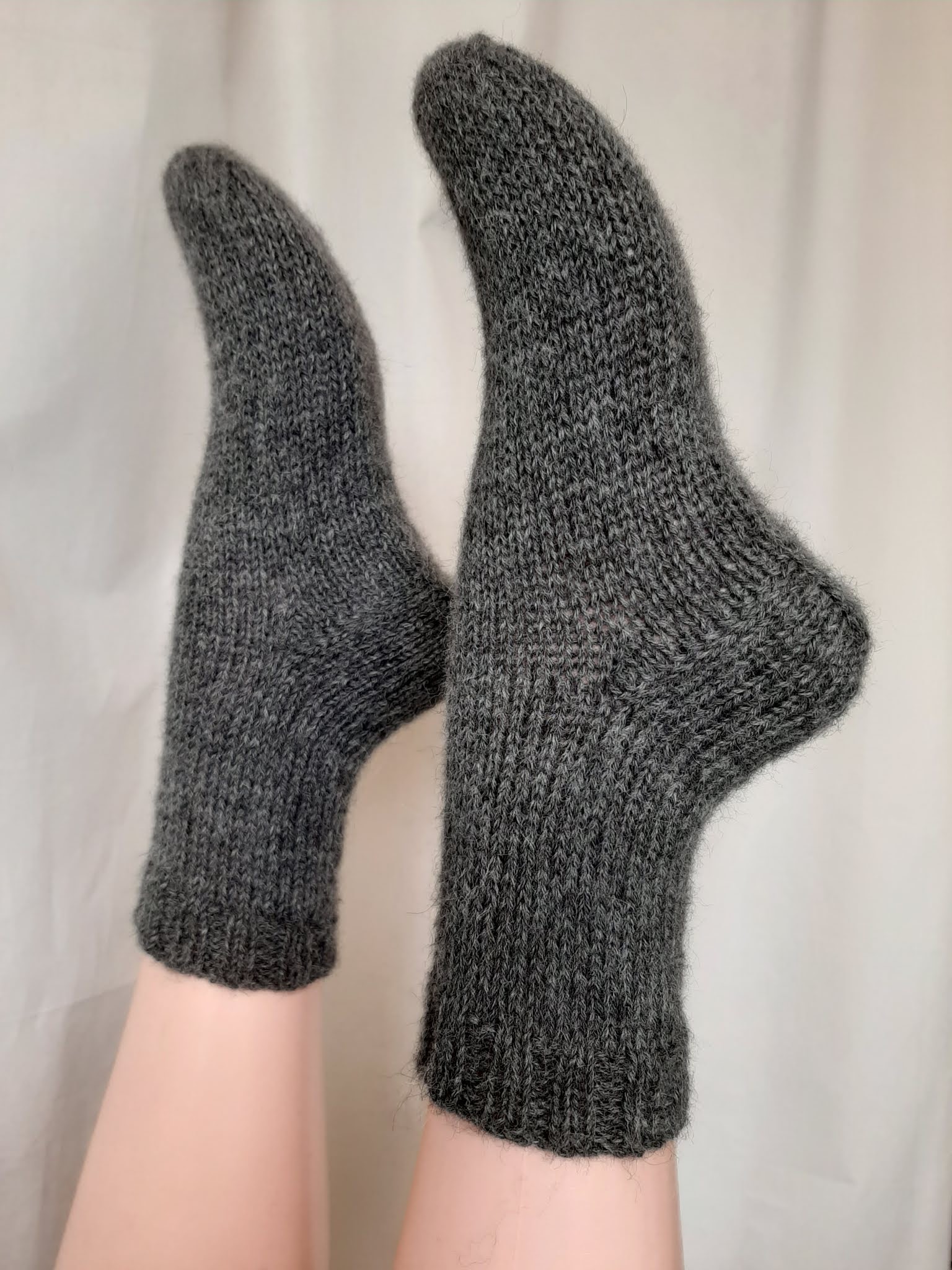 Sukkien pitää olla harmaat ja kun ehdotin jotain pitsikuviota, niin ei…. Okei, tein siis tylsät, mutta laadukkaat sukat. Kahdet. Lankaa kului vajaa 100 gr sukkapariin.