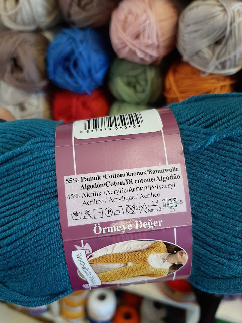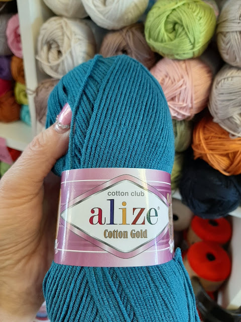 Meillä on kyllä myynnissä jo tosi monenlaista puuvillalankaa, mutta nyt lähdin etsimään vähän paksumpaa. Tällaista Alize Cotton Goldia tuli monen värisenä. Se on puuvilla-akryylilanka ja vaikka en yleensä myy juuri mitään akryyliä, tämä puoltaa paikkaansa, sillä puuvilla yksistään on esimerkiksi puserona aika painava ja akryyli tekee siitä vähän kevyemmän.