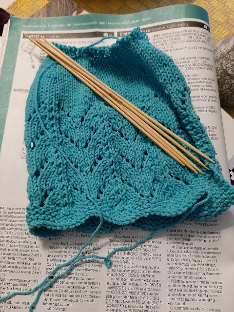 Neuloin pitsiosuuden ohuemmilla puikoilla kuin ohjeessa ja langassa oli. Käytin Addin metallisia pyöröpuikkoja, mitä en ole ehkä koskaan kokeillut, mutta ihan hyvin ne toimi tämän langan kanssa. Koko 2,5 mm. Myssyn päälaella vaihdetaan sukkapuikkoihin, käytin bambuisia nro 2,75.