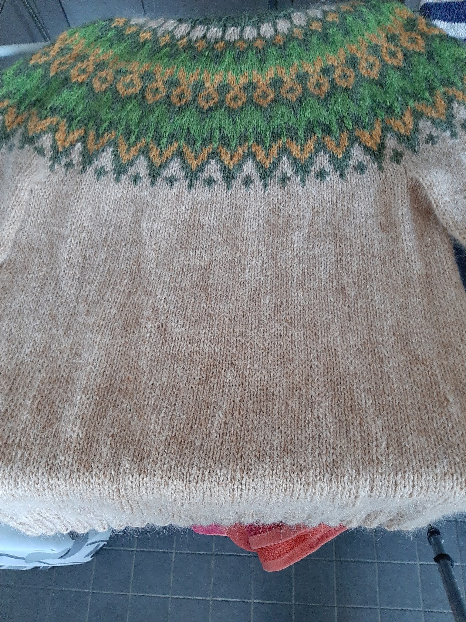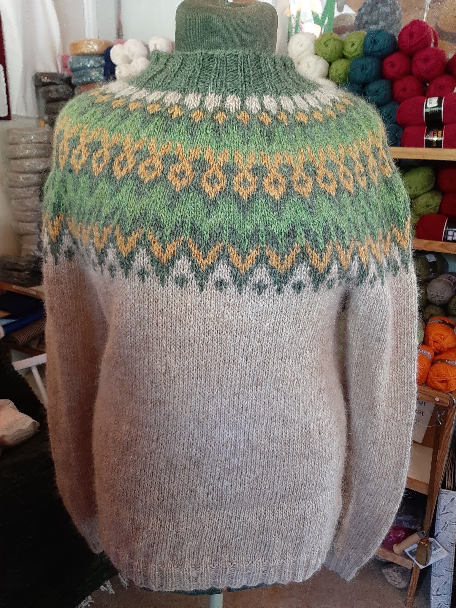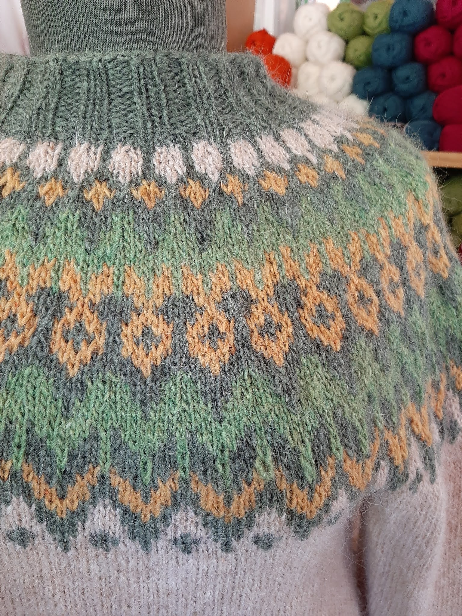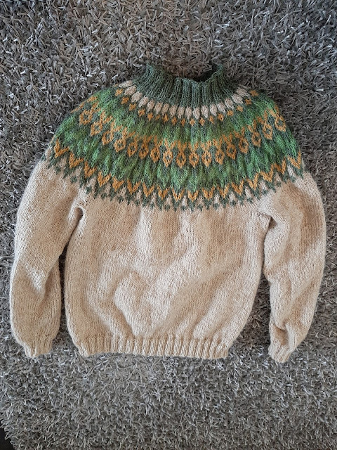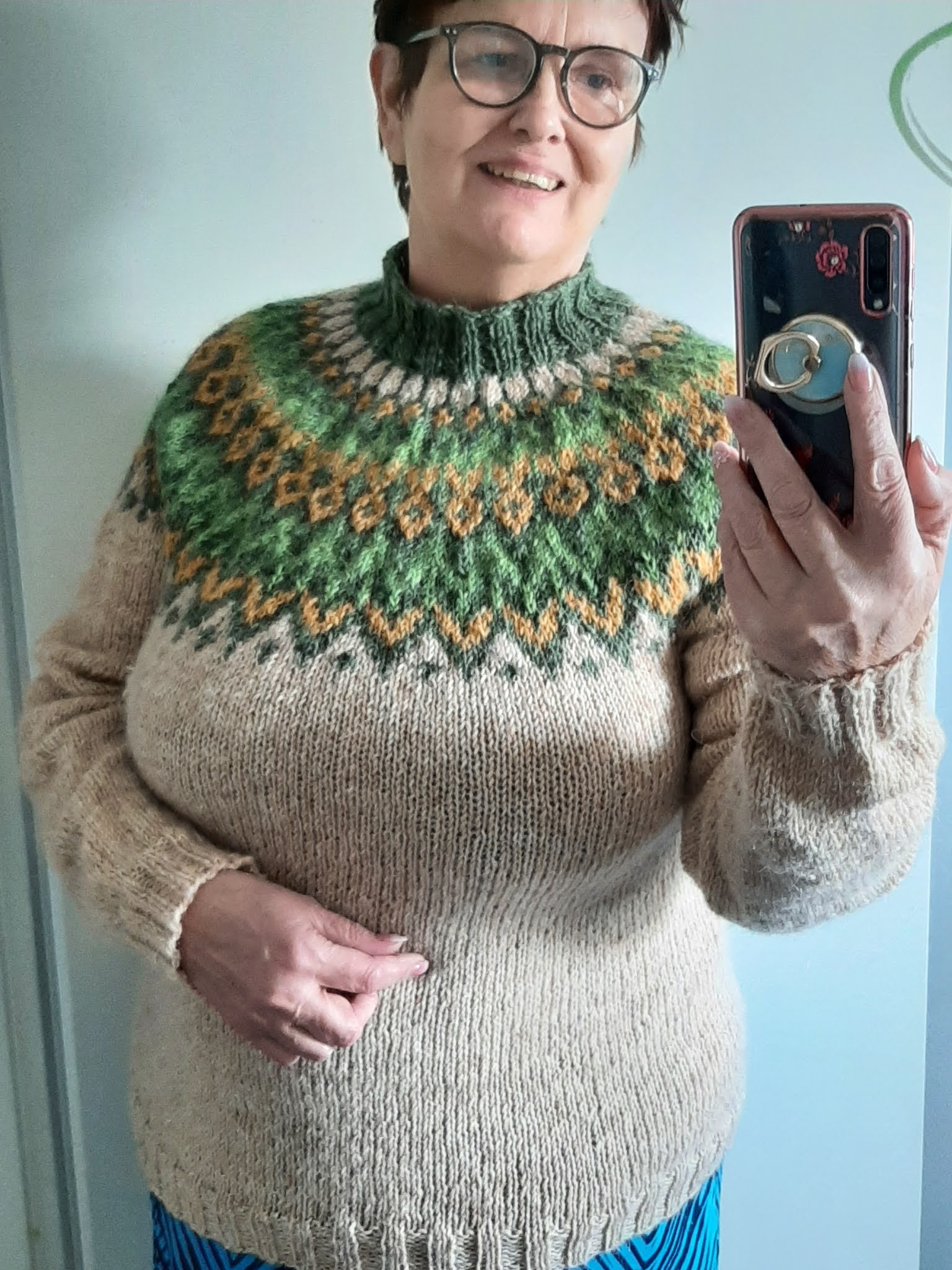 Otsikoksi laitoin vihreä islantilainen, vaikka eihän se oikesti ole. Tavoitteena oli tehdä sellainen metsässä viihtyvän pusero, mutta enpä tiedä…