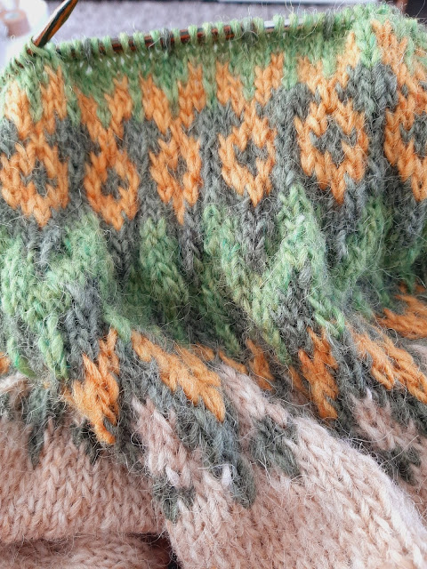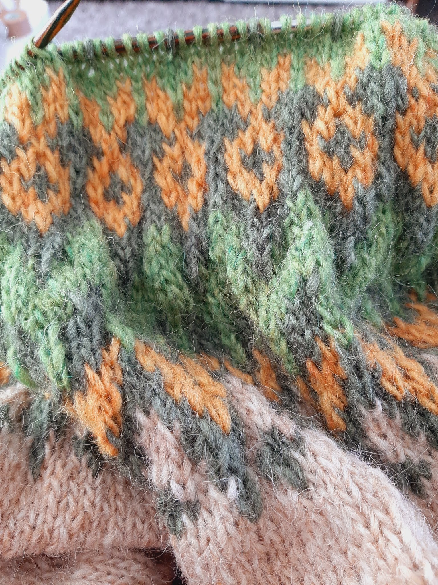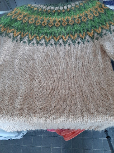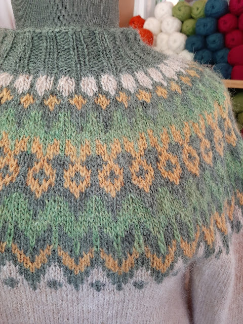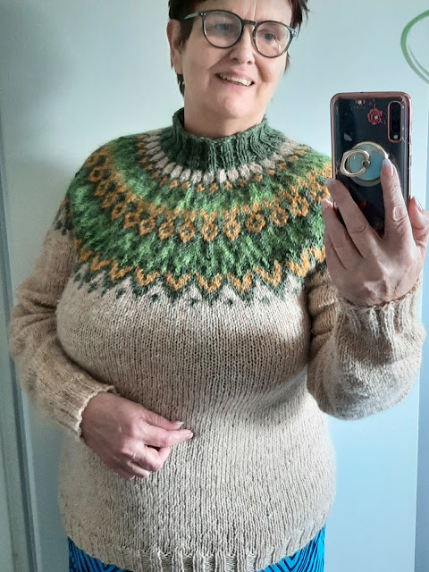 En oikein saanut sopimaan vihreitä toisiinsa, osa oli liian sinivihreitä. Sitten innostuin tuosta keltaisesta ja lopulta puserosta tuli aika värikäs – eikä sellainen, mitä kuvittelin. Mutta ei se haittaa, ihan varmasti jollekin kelpaa. Malli on Islantilaisia neuleita -kirjasta Riddari, mutta omin virhein. En ymmärrä, etten vieläkään osaa mallia orjallisesti noudattaa, vaikka silmä kovana kaaviota seuraankin – aina tulee jotain kommervenkkejä. Mutta minua ei haittaa, ihan kivat pupunkorvat tuli tähän puseroon tahtomattani.