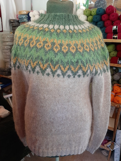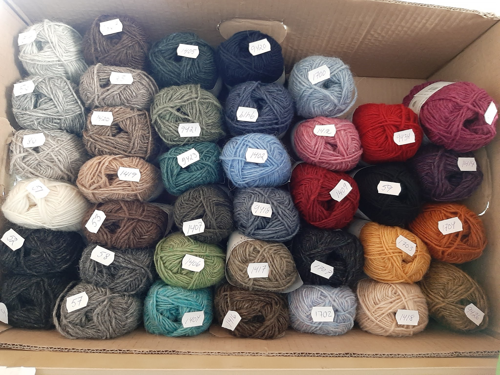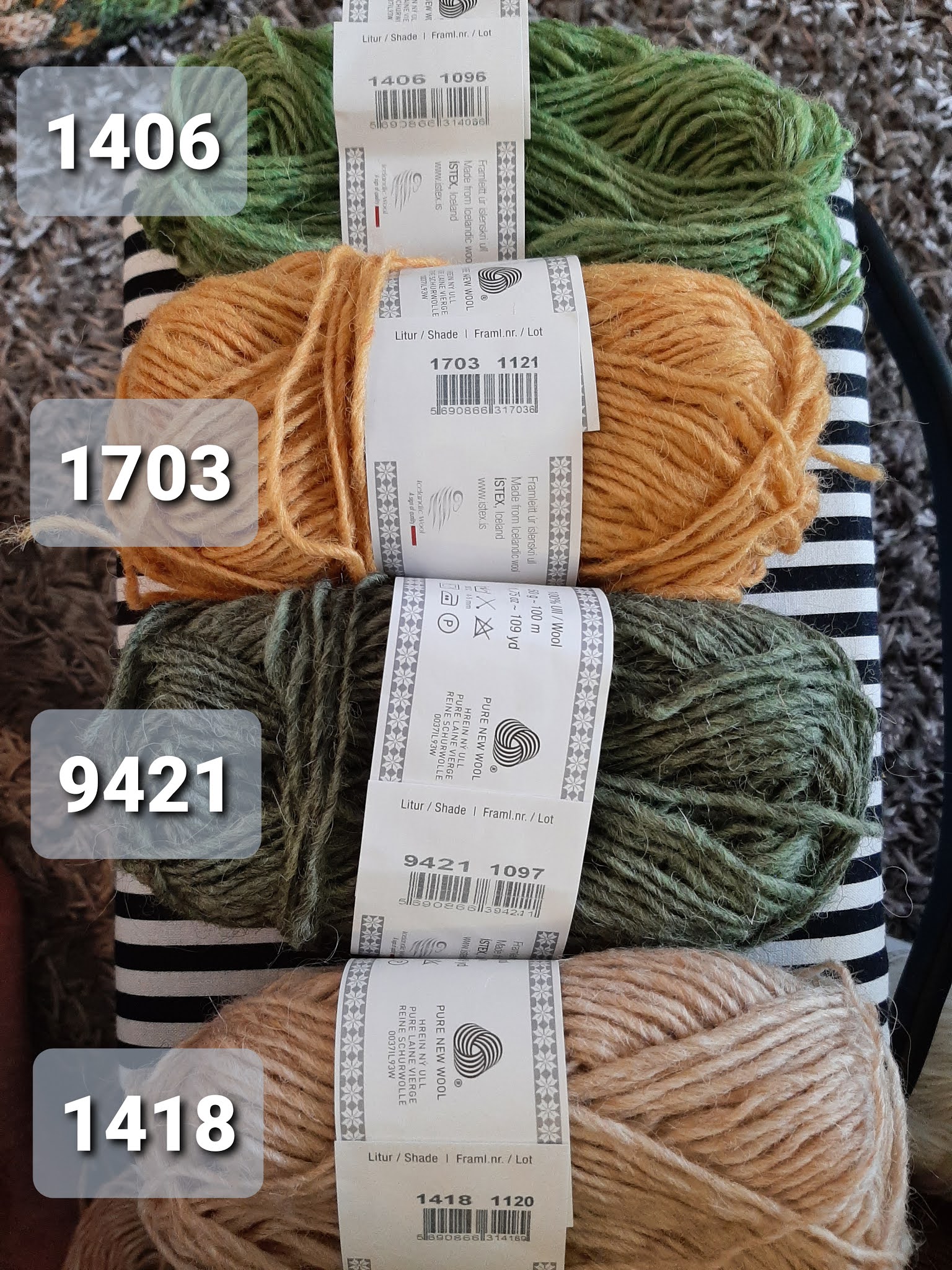 Mulla on puodissa hurjan hyvä valikoima lettlopeja, joten helppo suunnitella seuraavaa. Nyt on tulossa tilaustyö asiakkaan Alafosslopista ja seuraavaksi Lettlopista sininen meriaiheinen. Jos sulla ei ole haluamiasi lankoja, voin lähettää. Tässä meidän värit. Niin ja Alafosslopiakin alkaa nyt ehkä tulla, valkoista saimme jo.
